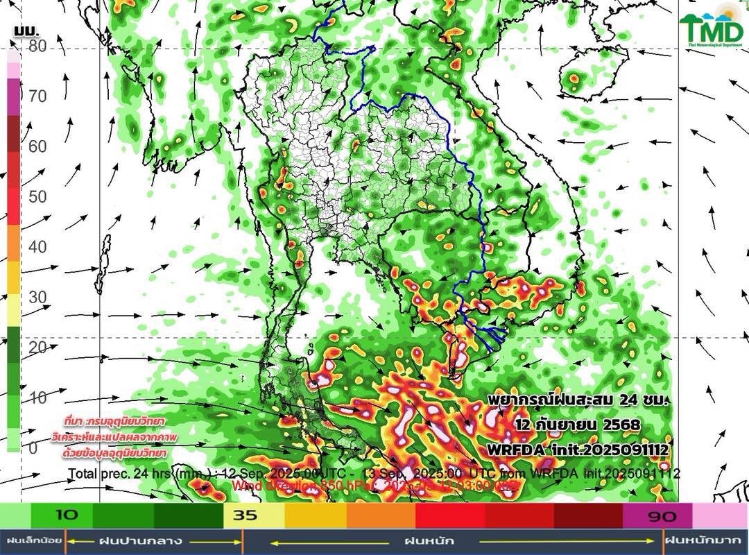 12 ก.ย. 2568 – กรมอุตุนิยมวิทยา อัปเดตผลการพยากรณ์ฝนสะสมรายวัน (ทุกๆ 24 ชม.:(นับตั้งแต่ 07.00 น. ถึง 07.00 น.วันรุ่งขึ้น) และลมที่ระดับ 850hPa (1.5 กม.) 10 วันล่วงหน้า ระหว่าง 12 – 21 ก.ย. 68 init. 2025091112 จากแบบจำลองของกรมอุตุนิยมวิทยา (TMD-WRFDA) วิเคราะห์ตามผลจากแบบจำลองฯ เฉดสีแดงหมายถึงฝนหนัก สีเขียวหมายถึงฝนเล็กน้อย :