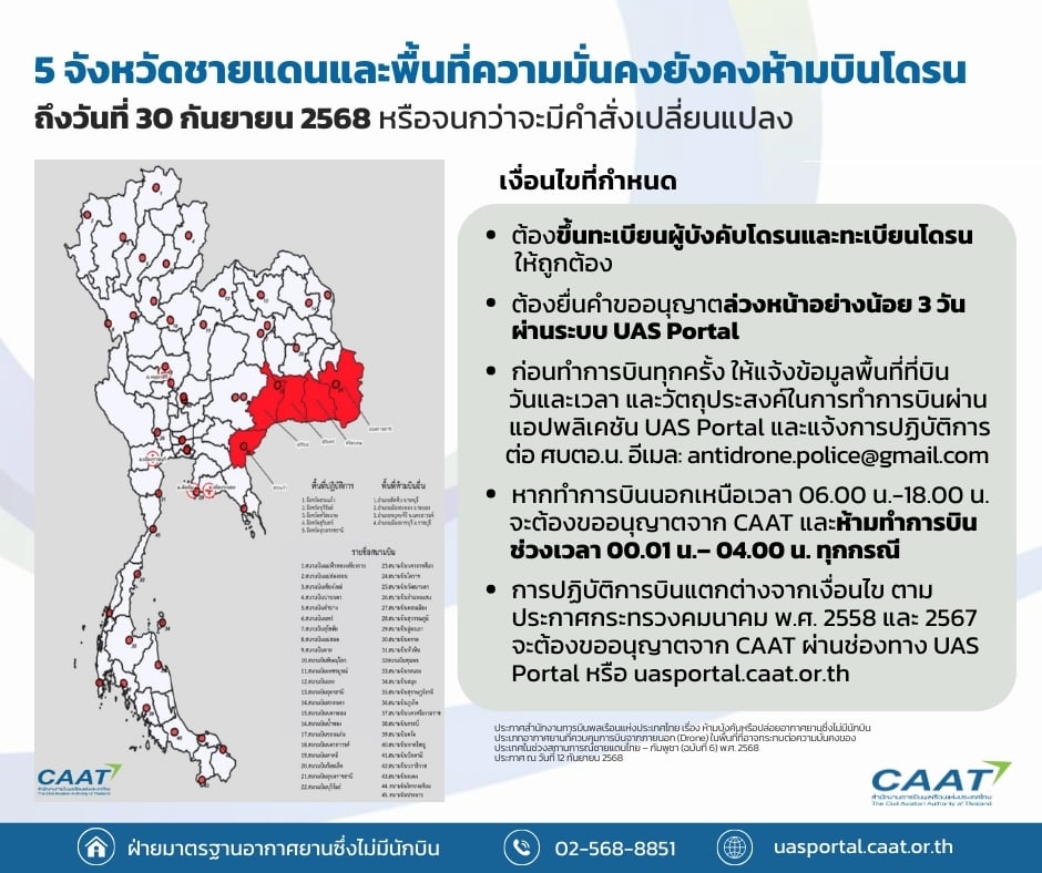 CAAT ออกประกาศฉบับที่ 6 ยังคงห้ามบินโดรนในพื้นที่ 5 จังหวัดชายแดน และพื้นที่ความมั่นคง ถึงวันที่ 30 ก.ย.68