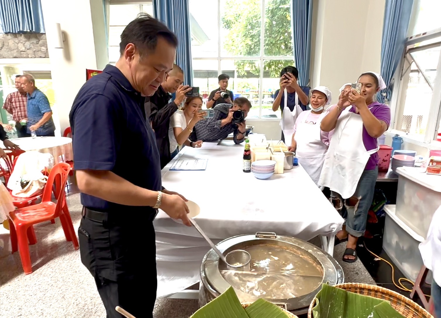 เมื่อมาถึงนายอนุทินได้เดินตรงมายังซุ้มก๋วยเตี๋ยวหมูต้มยำ พร้อมโชว์ฝีมือลวกเส้นก๋วยเตี๋ยวและลูกชิ้นเอง ซึ่งนายอนุทินได้ทำก๋วยเตี๋ยวเส้นเล็กต้มยำแห้ง ก่อนบอกแม่ค้าว่า “ขอกากหมูเพิ่ม” พร้อมกล่าวเชิญชวนผู้สื่อข่าวกินด้วยกันไหม