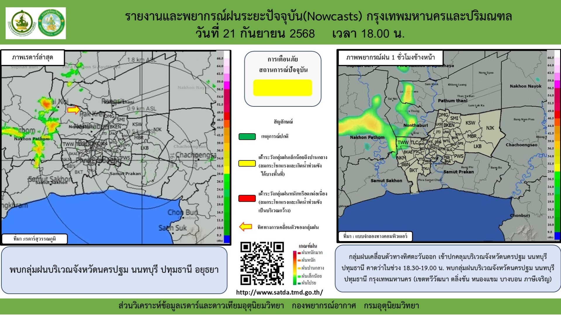 21 ก.ย.2568-เพจกรมอุตุนิยมวิทยา โพสต์ข้อความพบกลุ่มฝนบริเวณจังหวัดนครปฐม นนทบุรี ปทุมธานี อยุธยา กลุ่มฝนเคลื่อนตัวทางทิศตะวันออก เข้าปกคลุมบริเวณจังหวัดนครปฐม นนทบุรี ปทุมธานี คาดว่าในช่วง 18.30-19.00 น. พบกลุ่มฝนบริเวณจังหวัดนครปฐม นนทบุรี ปทุมธานี กรุงเทพมหานคร (เขตทวีวัฒนา ตลิ่งชัน หนองแขม บางบอน ภาษีเจริญ)