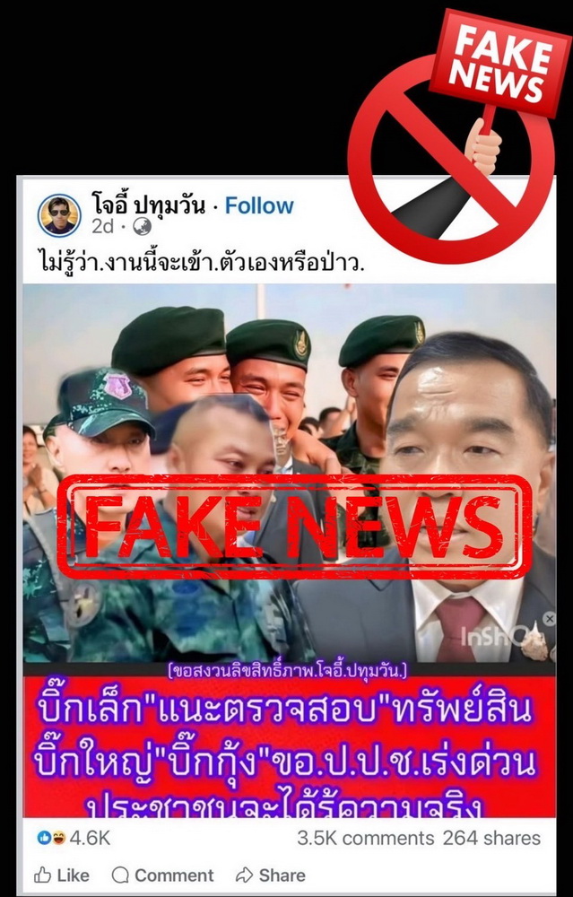 24 กันยายน 2568 - พล.ท.บุญสิน พาดกลาง แม่ทัพภาคที่ 2 เปิดเผยว่า ตามที่มีการเผยแพร่ข้อความบิดเบือนผ่านสังคมออนไลน์ ว่า บิ๊กเล็กแนะตรวจสอบทรัพย์สิน “บิ๊กกุ้ง” ขอ ป.ป.ช.เร่งด่วนประชาชนจะได้รู้ความจริง โดยเพจของ โจอี้ ปทุมวัน ว่า เรื่องดังกล่าวไม่เป็นความจริง เป็นเฟกนิวส์ เพื่อเป็นการสร้างความแตกแยกระดับนโยบายและระดับปฏิบัติ