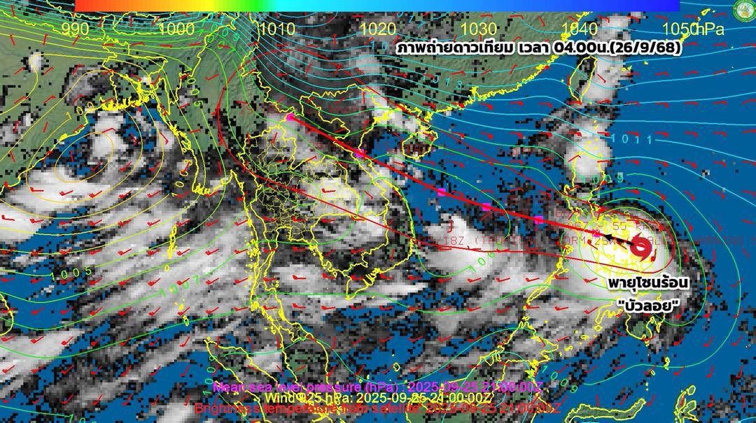 26 ก.ย. 2568 – กรมอุตุนิยมวิทยา อัปเดตพายุโซนร้อน “บัวลอย” (BUALOI) เช้าวันที่ 26 ก.ย. 68 ดังนี้ ศูนย์กลางอยู่ตอนกลางฟิลิปปินส์ เคลื่อนตัวเร็ว 40 กม./ชม. คาดผ่านฟิลิปปินส์ลงทะเลจีนใต้ในคืนนี้ มีแนวโน้มเคลื่อนขึ้นไปทางตะวันตกเฉียงเหนือ เข้าใกล้ชายฝั่งเวียดนาม–อ่าวตังเกี๋ย ยังมีอุปสรรคจากภูมิประเทศและมวลอากาศเย็นที่แผ่ปกคลุม ทิศทางอาจเปลี่ยนแปลงช่วง 28–29 ก.ย. 68 ติดตามประกาศกรมอุตุนิยมวิทยาอย่างใกล้ชิดเมื่อพายุเข้าสู่ทะเลจีนใต้.