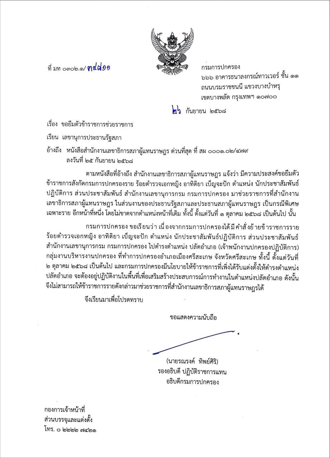 โดยมีรายละเอียดว่า ตามหนังสือที่อ้างถึง สำนักงานเลขาธิการสภาผู้แทนราษฎร แจ้งว่า มีความประสงค์ขอยืมตัวข้าราชการสังกัดกรมการปกครองราย ร้อยตำรวจเอกหญิง อาทิติยา เบ็ญจะปัก ตำแหน่ง นักประชาสัมพันธ์ปฏิบัติการ ส่วนประชาสัมพันธ์ สำนักงานเลขานุการกรม กรมการปกครอง มาช่วยราชการที่สำนักงานเลขาธิการสภาผู้แทนราษฎร ในส่วนงานของประธานรัฐสภาและประธานสภาผู้แทนราษฎร เป็นกรณีพิเศษเฉพาะราย อีกหน้าที่หนึ่ง โดยไม่ขาดจากตำแหน่งหน้าที่เดิม ทั้งนี้ ตั้งแต่วันที่1ตุลาคม 2568 เป็นต้นไป นั้น