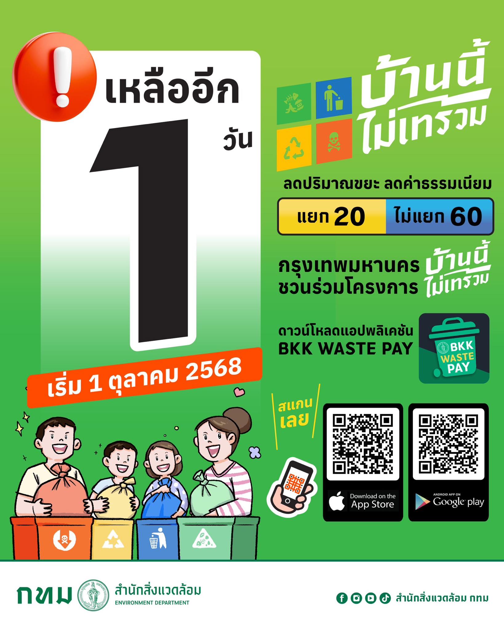 30 ก.ย. 2568 – ชาว กทม.รู้หรือยัง วันที่ 1 ต.ค. กรุงเทพมหานคร จะปรับอัตราค่าธรรมเนียมขยะใหม่ จาก 20 บาทต่อเดือน เป็น 60 บาทต่อเดือน เพื่อให้สอดคล้องกับสภาวการณ์และภาระค่าใช้จ่ายในปัจจุบัน แต่ถ้าบ้านไหนแยกขยะและร่วมลงทะเบียนเข้าร่วมโครงการบ้านนี้ไม่เทรวม แยกขยะลดค่าธรรมเนียม ก็จะได้รับสิทธิจ่าย 20 บาทเท่าเดิม