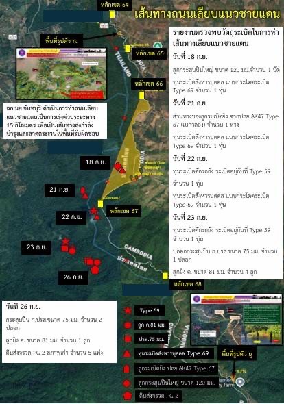 ฉก.นย.จันทบุรี สร้างถนนเลียบชายแดนไทย-กัมพูชาเร่งด่วน 15 กม. ส่งกำลังบำรุง พบวัตถุระเบิด-ทุ่นระเบิด อื้อ คงเหลือระยะทางจริงอีก 4 กิโลเมตร หรือร้อยละ 26% ของการสร้างถนน