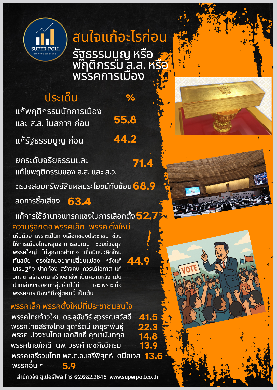 คนไทยสนใจอยากแก้อะไรก่อน ระหว่าง พฤติกรรม สส. กับ รัฐธรรมนูญ หรือ พรรคเล็ก พรรคตั้งใหม่