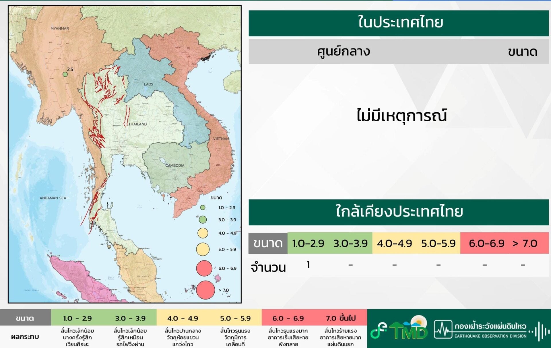 10 ต.ค. 2568 – กรมอุตุนิยมวิทยา รายงานว่า เหตุแผ่นดินไหวขนาด 7.6 นอกชายฝั่งฟิลิปปินส์ ไม่กระทบประเทศไทย โดยวันที่ 10 ตุลาคม 2568 เวลา 08.43 น. ตามเวลาไทย สำนักงานสำรวจธรณีวิทยาสหรัฐ (USGS) รายงานการเกิดแผ่นดินไหวขนาด 7.6 แมกนิจูด บริเวณนอกชายฝั่งตะวันออกของเกาะมินดาเนา ประเทศฟิลิปปินส์ ที่ความลึกประมาณ 10 – 23 กิโลเมตร