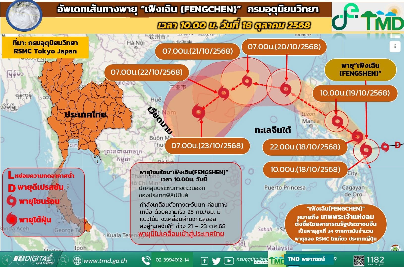 18 ตุลาคม 2568 - กรมอุตุนิยมวิทยา อัปเดตเส้นทางพายุโซนร้อน "เฟิงเฉิน" (Fengchen) เวลา 10.00 น. วันนี้ พายุโซนร้อนเฟิงเฉิน ก่อตัวอยู่บริเวณด้านตะวันออกของประเทศฟิลิปปินส์ คาดว่าจะเคลื่อนผ่าน เกาะลูซอน แล้วลงสู่ ทะเลจีนใต้ตอนบน
