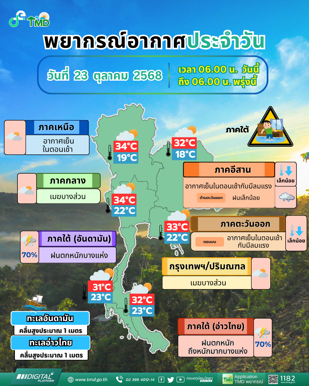 23 ต.ค.2568 - กรมอุตุนิยมวิทยาได้พยากรณ์อากาศ 24 ชั่วโมงข้างหน้าในลักษณะทั่วไป ว่าภาคใต้มีฝนตกหนักถึงหนักมากบางแห่ง เนื่องจากร่องมรสุมพาดผ่านภาคใต้ตอนกลาง ประกอบกับมรสุมตะวันออกเฉียงเหนือ พัดปกคลุมอ่าวไทยและภาคใต้ ขอให้ประชาชนบริเวณภาคใต้ โดยเฉพาะบริเวณจังหวัดนครศรีธรรมราช พัทลุง สงขลา และปัตตานี ระวังอันตรายจากฝนฟ้าคะนอง ฝนตกหนัก และฝนที่ตกสะสม รวมทั้งเพิ่มความระมัดระวังในการสัญจรผ่านบริเวณที่มีน้ำท่วมขังในระยะนี้ไว้ด้วย ส่วนบริเวณทะเลอันดามันและอ่าวไทยมีคลื่นสูงประมาณ 1 เมตร บริเวณที่มีฝนฟ้าคะนองคลื่นสูงมากกว่า 2 เมตร ขอให้ชาวเรือเดินเรือด้วยความระมัดระวัง และหลีกเลี่ยงการเดินเรือในบริเวณที่มีฝนฟ้าคะนอง สำหรับประเทศไทยตอนบนมีอากาศเย็นในตอนเช้า อุณหภูมิจะลดลงเล็กน้อยกับมีลมแรง เนื่องจากบริเวณความกดอากาศสูงกำลังปานกลางจากประเทศจีนได้แผ่ลงมาปกคลุมภาคเหนือและภาคตะวันออกเฉียงเหนือ ขอให้ประชาชนบริเวณประเทศไทยตอนบน โดยเฉพาะภาคเหนือ และภาคตะวันออกเฉียงเหนือ ดูแลรักษาสุขภาพเนื่องจากสภาพอากาศที่เปลี่ยนแปลง