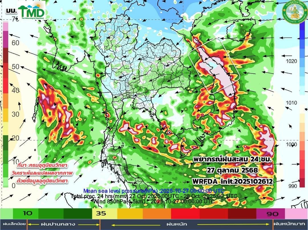 27 ต.ค. 2568 – กรมอุตุนิยมวิทยา อัปเดตผลการพยากรณ์ฝนสะสมรายวัน และลมที่ระดับ 925 hPa (750 ม.) 10 วันล่วงหน้า ระหว่างวันที่ 27 ตุลาคม – 5 พฤศจิกายน 2568 (ข้อมูลจากแบบจำลองของกรมอุตุนิยมวิทยา : TMD-WRFDA, init 2025102612) เฉดสีแสดงปริมาณฝน (มิลลิเมตร) สีเขียว = ฝนเล็กน้อย และสีแดง = ฝนหนัก (มากกว่า 35.1 มม.)
