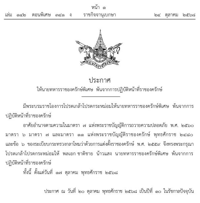 27 ตุลาคม 2568 - เว็บไซต์ราชกิจจานุเบกษา เผยแพร่พระบรมราชโองการ ประกาศ ให้นายทหารราชองครักษ์พิเศษ พ้นจากการปฏิบัติหน้าที่ราชองครักษ์ ความว่า