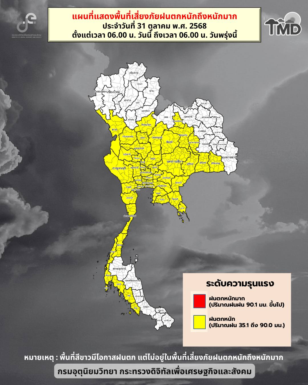 ประกาศ ณ วันที่ 31 ตุลาคม พ.ศ. 2568 เวลา 05.00 น. กรมอุตุนิยมวิทยาจะออกประกาศฉบับต่อไปในวันที่ 31 ตุลาคม พ.ศ. 2568 เวลา 17.00 น.