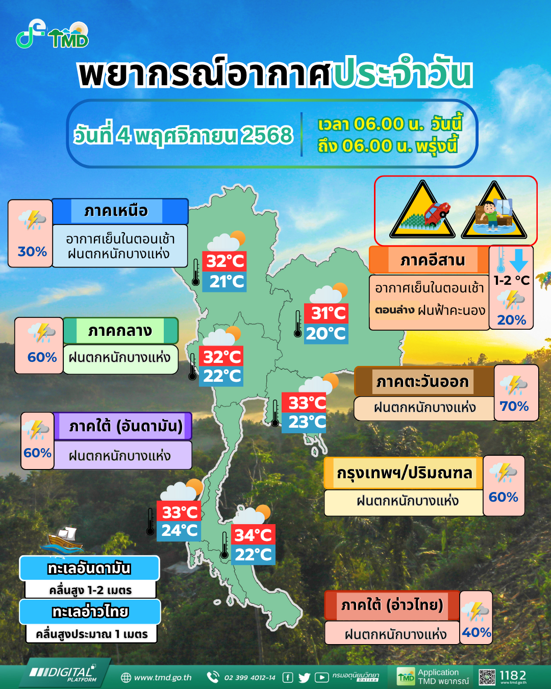 4 พ.ย.2568-กรมอุตุนิยมวิทยาพยากรณ์อากาศ 24 ชั่วโมงข้างหน้า ประเทศไทยตอนบนจะมีฝนลดลงแต่ยังคงมีฝนตกหนักเกิดขึ้นได้บางพื้นที่ โดยเฉพาะจังหวัดกรุงเทพมหานครรวมทั้ง