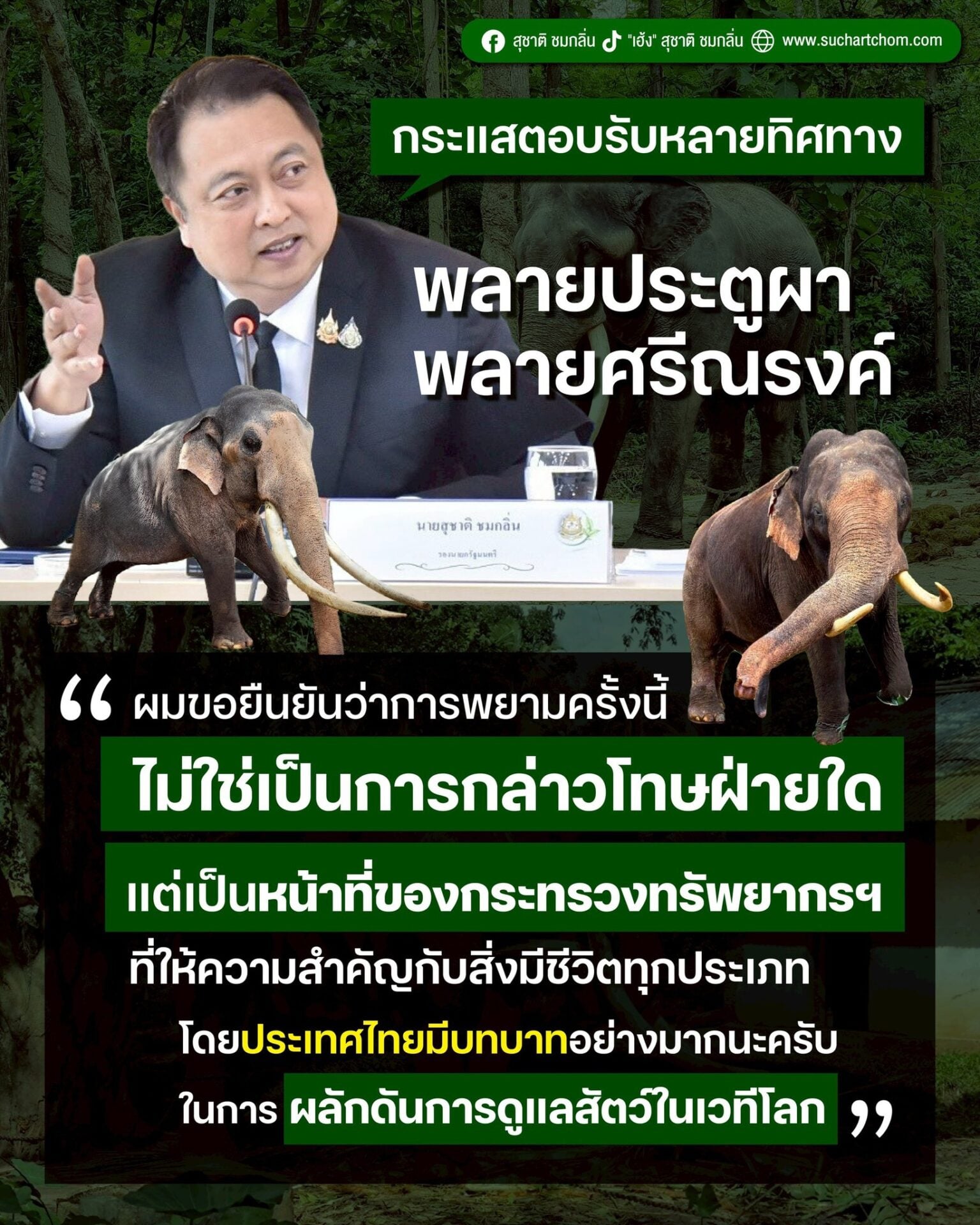 4 พ.ย. 2568- นายสุชาติ ชมกลิ่น รองนายกรัฐมนตรี และรัฐมนตรีว่าการกระทรวงทรัพยากรธรรมชาติและสิ่งแวดล้อม โพสต์ข้อความว่ามีกระแสตอบกลับมาหลายทิศทางภายหลังที่ผมได้ประกาศออกตัวว่าจะพา “พลายประตูผา-พลายศรีณรงค์” กลับมายังประเทศไทยบ้านเรา ฝ่ายหนึ่งก็ไม่เห็นด้วย ในขณะที่ฝ่ายที่สนับสนุนก็มีจำนวนมาก ผมในฐานะที่เป็นรัฐมนตรีว่าการฯ ผมไม่สามารถนิ่งนอนใจในเสียงเรียกร้องของพี่น้องประชาชน และผมเชื่อมั่นโดยสนิทใจว่าเสียงที่เรียกร้องของทุกท่าน เป็นเสียงที่บริสุทธิ์ของคนไทยที่รักช้างจากหัวใจจริงๆ