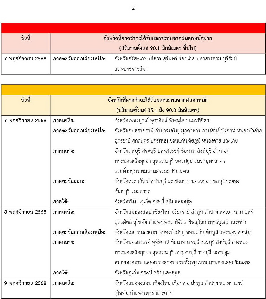 จากอิทธิพลดังกล่าว ส่งผลให้ในช่วงวันที่ 7-9 พ.ย. 68 ประเทศไทยตอนบนมีฝนตกหนักถึงหนักมากบางพื้นที่ บริเวณด้านตะวันตกของภาคตะวันออกเฉียงเหนือ ภาคตะวันออก ภาคกลาง และภาคเหนือตามลำดับ ขอให้ประชาชนในบริเวณดังกล่าวระวัง อันตรายจากฝนตกหนักถึงหนักมาก และฝนที่ตกสะสม ซึ่งอาจทำให้เกิดน้ำท่วมฉับพลัน น้ำป่าไหลหลาก และน้ำล้นตลิ่ง โดยเฉพาะ พื้นที่ลาดเชิงเขาใกล้ทางน้ำไหลผ่าน พื้นที่ลุ่ม และพื้นที่น้ำท่วมขัง สำหรับเกษตรกรควรป้องกันและระวังความเสียหายที่จะเกิดต่อผลผลิตทางการเกษตร