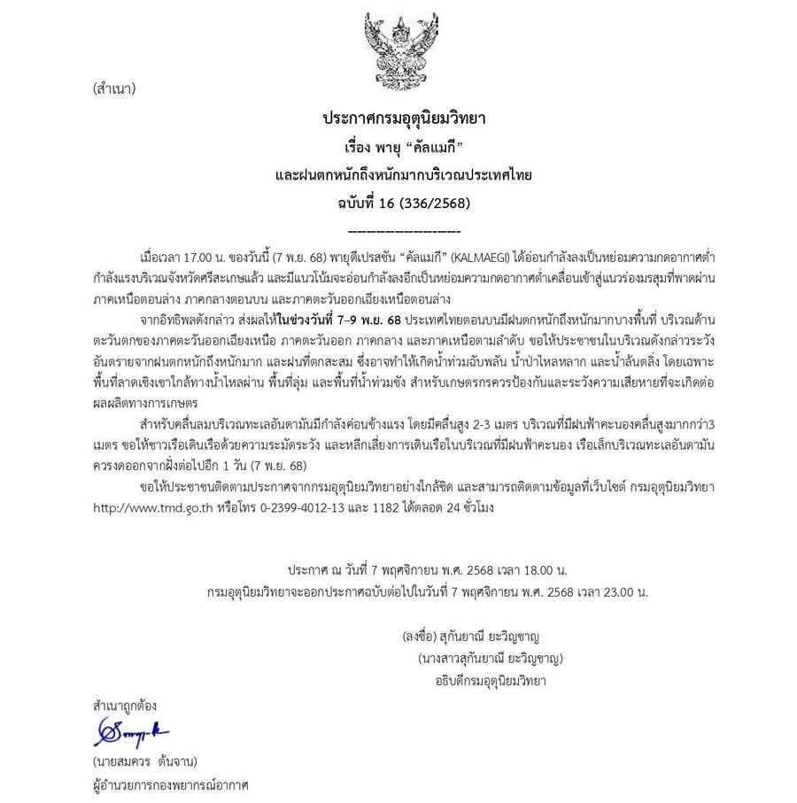 7 พฤศจิกายน 2568 - เวลา 17.00 น.กรมอุตุนิยมวิทยา ประกาศเรื่อง พายุ "คัลแมกี" และฝนตกหนักถึงหนักมากบริเวณประเทศไทย ฉบับที่ 16 ระบุว่า เมื่อเวลา 17.00 น. ของวันนี้ (7 พ.ย. 68) พายุดีเปรสชัน “คัลแมกี” (KALMAEGI) ได้อ่อนกำลังลงเป็นหย่อมความกดอากาศต่ำ กำลังแรงบริเวณจังหวัดศรีสะเกษแล้ว และมีแนวโน้มจะอ่อนกำลังลงอีกเป็นหย่อมความกดอากาศต่ำเคลื่อนเข้าสู่แนวร่องมรสุมที่พาดผ่านภาคเหนือตอนล่าง ภาคกลางตอนบน และภาคตะวันออกเฉียงเหนือตอนล่าง