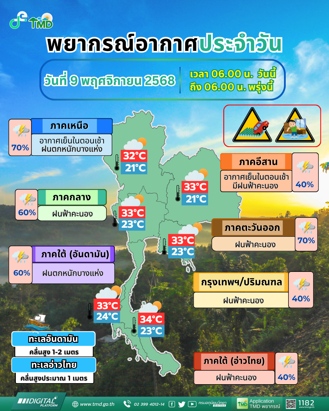 9 พ.ย.68 กรมอุตุนิยมวิทยา รายงานพยากรณ์อากาศ 24 ชั่วโมงข้างหน้า ภาคเหนือมีฝนตกหนักบางแห่ง โดยเฉพาะบริเวณจังหวัดแม่ฮ่องสอน เชียงใหม่ เชียงราย ลำพูน ลำปาง พะเยา และตาก เนื่องจากหย่อมความกดอากาศต่ำปกคลุมด้านตะวันตกของภาคเหนือและประเทศเมียนมา ขอให้ประชาชนในบริเวณดังกล่าวระวังอันตรายจากฝนตกหนักและฝนที่ตกสะสมซึ่งอาจทำให้เกิดน้ำท่วมฉับพลัน น้ำป่าไหลหลาก และน้ำล้นตลิ่ง โดยเฉพาะพื้นที่ลาดเชิงเขาใกล้ทางน้ำไหลผ่าน พื้นที่ลุ่ม และพื้นที่น้ำท่วมขัง ส่วนเกษตรกรควรป้องกันและระวังความเสียหายที่จะเกิดต่อผลผลิตทางการเกษตร