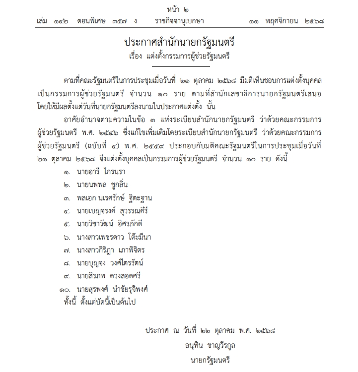 อาศัยอำนาจตามความในข้อ 3 แห่งระเบียบสำนักนายกรัฐมนตรี ว่าด้วยคณะกรรมการผู้ช่วยรัฐมนตรี พ.ศ. 2546 ซึ่งแก้ไขเพิ่มเติมโดยระเบียบสำนักนายกรัฐมนตรี ว่าด้วยคณะกรรมการผู้ช่วยรัฐมนตรี (ฉบับที่ 4) พ.ศ. 2559 ประกอบกับมติคณะรัฐมนตรีในการประชุมเมื่อวันที่ 21 ตุลาคม 2568 จึงแต่งตั้งบุคคลเป็นกรรมการผู้ช่วยรัฐมนตรี จำนวน 10 ราย ดังนี้