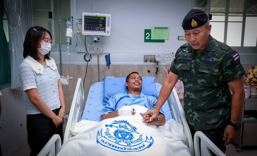 จากนั้นได้เดินทางไปเยี่ยมผู้ป่วยและมอบสิ่งของบำรุงขวัญแก่กำลังพลที่ได้รับบาดเจ็บจากการปฏิบัติภารกิจการลาดตระเวนในพื้นที่รับผิดชอบ (กรณีกำลังพลเหยียบกับระเบิด ที่ทางฝ่ายกัมพูชาได้ลักลอบเข้ามาวาง ในพื้นที่ห้วยตามาเรีย) ที่โรงพยาบาลค่ายสรรพสิทธิประสงค์ จังหวัดอุบลราชธานี พร้อมทั้งได้ตรวจเยี่ยมหน่วยฝึกทหารใหม่ของมณฑลทหารบกที่ 22 เพื่อให้กำลังใจกับน้องๆทหารใหม่ที่เพิ่งเข้ามาประจำการ ให้มีขวัญและกำลังใจในการฝึก และมีความภาคภูมิใจในการเข้ามาเป็นทหาร