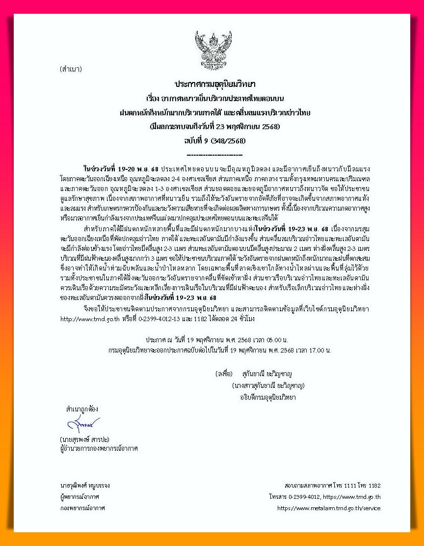 19 พ.ย.2568 - นางสาวสุกันยาณี ยะวิญชาญ อธิบดีกรมอุตุนิยมวิทยา ออกประกาศกรมอุตุนิยมวิทยา เรื่อง อากาศหนาวเย็นบริเวณประเทศไทยตอนบน ฝนตกหนักถึงหนักมากบริเวณภาคใต้ และคลื่นลมแรงบริเวณอ่าวไทย (มีผลกระทบจนถึงวันที่ 23 พฤศจิกายน 2568) ฉบับที่ 9 (348/2568) ระบุว่า