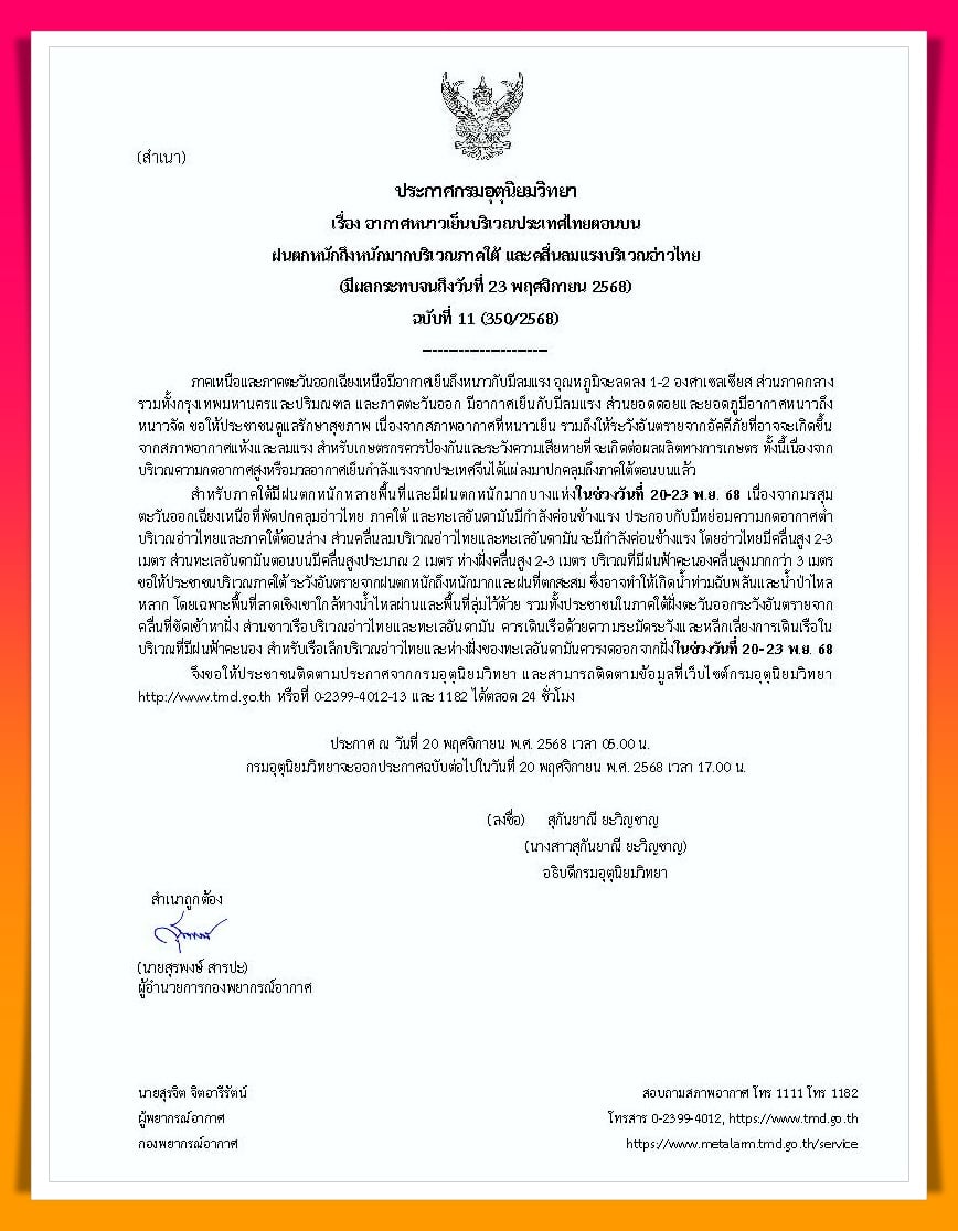 20 พ.ย.2568 - นางสาวสุกันยาณี ยะวิญชาญ อธิบดีกรมอุตุนิยมวิทยา ออกประกาศกรมอุตุนิยมวิทยา เรื่อง อากาศหนาวเย็นบริเวณประเทศไทยตอนบน ฝนตกหนักถึงหนักมากบริเวณภาคใต้ และคลื่นลมแรงบริเวณอ่าวไทย (มีผลกระทบจนถึงวันที่ 23 พฤศจิกายน 2568) ฉบับที่ 11 (350/2568) ระบุว่า