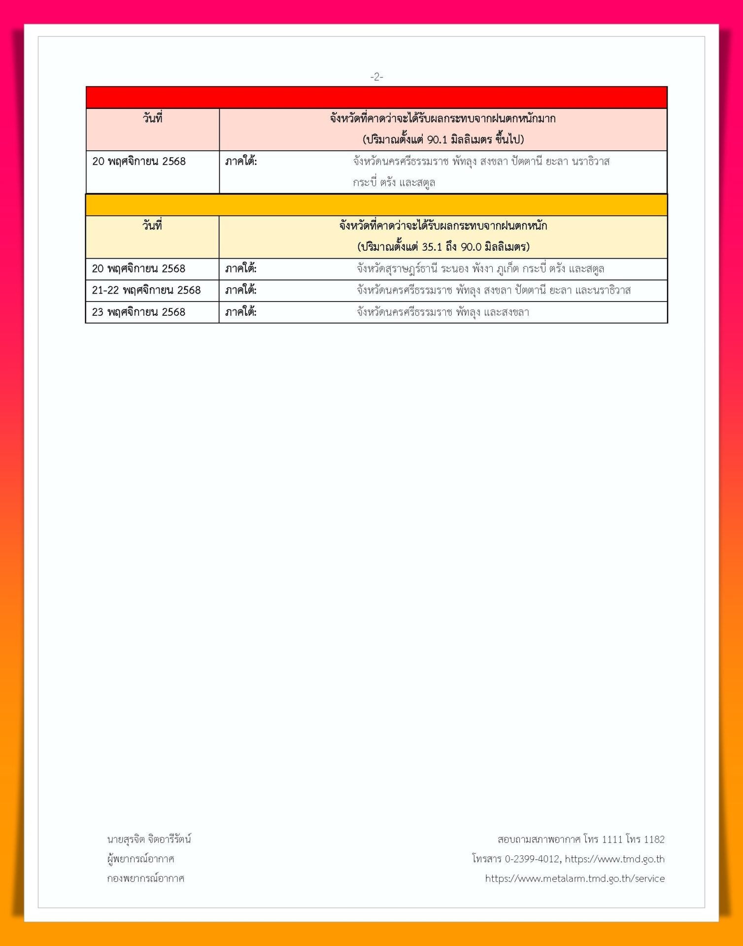 สำหรับภาคใต้มีฝนตกหนักหลายพื้นที่และมีฝนตกหนักมากบางแห่งในช่วงวันที่ 20-23 พ.ย. 68 เนื่องจากมรสุมตะวันออกเฉียงเหนือที่พัดปกคลุมอ่าวไทย ภาคใต้ และทะเลอันดามันมีกำลังค่อนข้างแรง ประกอบกับมีหย่อมความกดอากาศต่ำบริเวณอ่าวไทยและภาคใต้ตอนล่าง ส่วนคลื่นลมบริเวณอ่าวไทยและทะเลอันดามันจะมีกำลังค่อนข้างแรง โดยอ่าวไทยมีคลื่นสูง 2-3 เมตร ส่วนทะเลอันดามันตอนบนมีคลื่นสูงประมาณ 2 เมตร ห่างฝั่งคลื่นสูง 2-3 เมตร บริเวณที่มีฝนฟ้าคะนองคลื่นสูงมากกว่า 3 เมตร ขอให้ประชาชนบริเวณภาคใต้ ระวังอันตรายจากฝนตกหนักถึงหนักมากและฝนที่ตกสะสม ซึ่งอาจทำให้เกิดน้ำท่วมฉับพลันและน้ำป่าไหลหลาก โดยเฉพาะพื้นที่ลาดเชิงเขาใกล้ทางน้ำไหลผ่านและพื้นที่ลุ่มไว้ด้วย รวมทั้งประชาชนในภาคใต้ฝั่งตะวันออกระวังอันตรายจากคลื่นที่ซัดเข้าหาฝั่ง ส่วนชาวเรือบริเวณอ่าวไทยและทะเลอันดามัน ควรเดินเรือด้วยความระมัดระวังและหลีกเลี่ยงการเดินเรือในบริเวณที่มีฝนฟ้าคะนอง สำหรับเรือเล็กบริเวณอ่าวไทยและห่างฝั่งของทะเลอันดามันควรงดออกจากฝั่งในช่วงวันที่ 20-23 พ.ย. 68