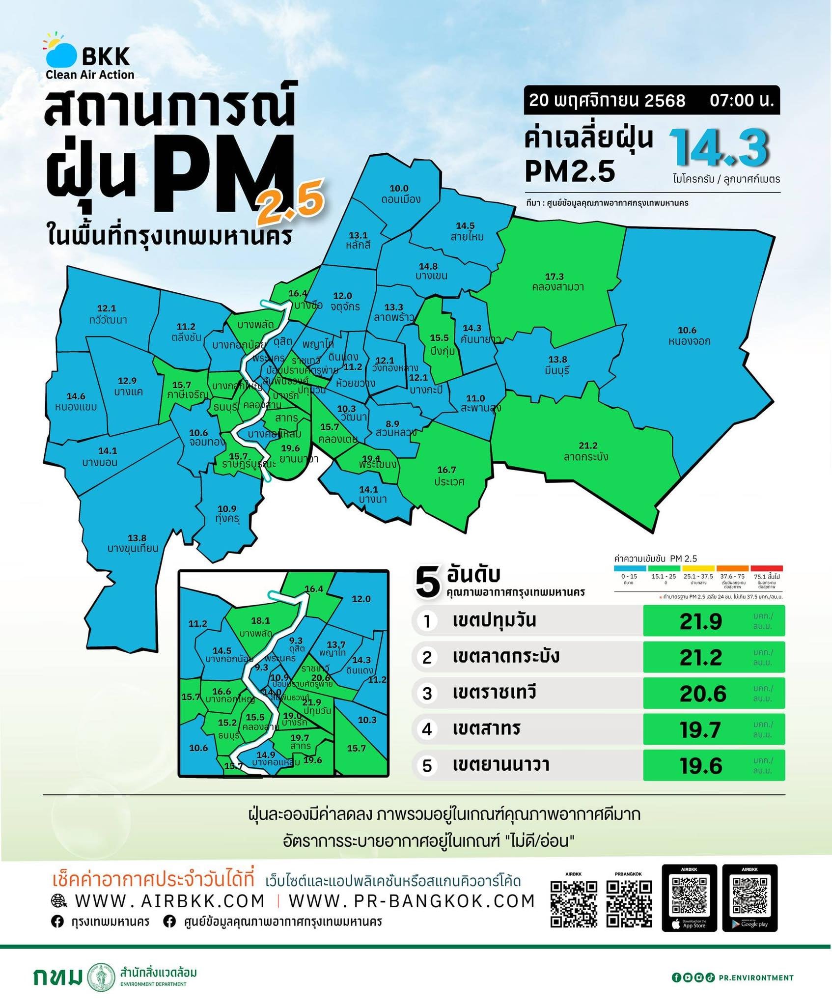 20 พฤศจิกายน 2568 - เพจเฟซบุ๊ก กรุงเทพมหานคร รายงานคุณภาพอากาศเช้าวันนี้ กทม. อยู่ในเกณฑ์ดีมาก PM2.5 ค่าเฉลี่ย 14.3 มคก./ลบ.ม.