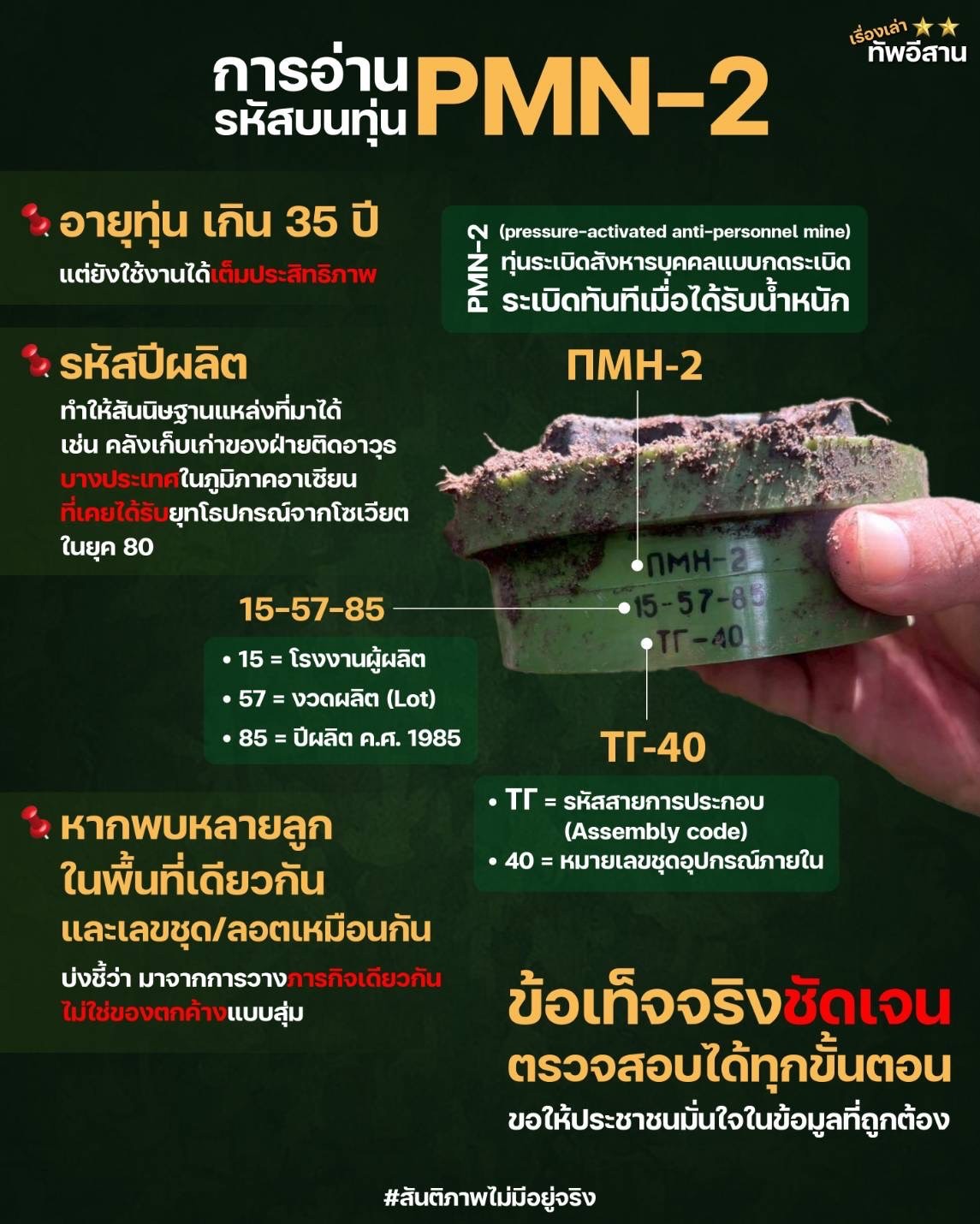 21พ.ย.2568 - ทหารผู้เชี่ยวชาญด้านวัตถุระเบิด ได้ออกมาเผยแพร่ข้อมูล ตัวอักษรและตัวเลขที่อยู่บนทุ่นระเบิด PMN-2 ตรวจพบในเขต อธิปไตยของไทย ซึ่งประเทศไทยไม่เคยมีทุ่นระเบิดทุกชนิด ตามอนุสัญญาออตตาวา (Ottawa Convention) ที่ห้ามการใช้ สะสม ผลิต และถ่ายโอนทุ่นระเบิดสังหารบุคคล