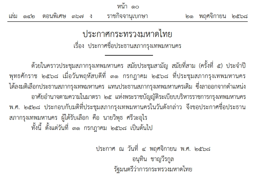 ด้วยในคราวประชุมสภากรุงเทพมหานคร สมัยประชุมชุมสามัญ สมัยที่สาม (ครั้งที่ ๕) ประจำปีพุทธศักราช ๒๕๖๘ เมื่อวันพฤหัสบดีที่ ๓๑ กรกฎาคม ๒๕๖๘ ที่ประชุมสภากรุงเทพมหานครได้ลงมติเลือกประธานสภากรุงเทพมหานคร แทนประธานสภากรุงเทพมหานครเดิม ซึ่งลาออกจากตำแหน่ง