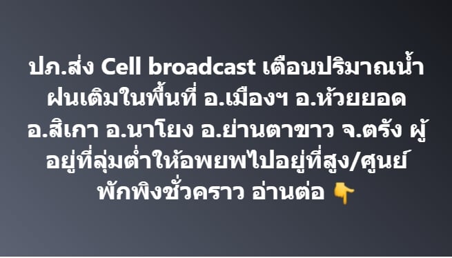 ปภ. จึงได้ร่วมกับผู้ให้บริการเครือข่ายโทรศัพท์เคลื่อนที่ AIS True และ NT ส่งข้อความแจ้งเตือนผ่าน Cell Broadcast ในพื้นที่ อ.เมืองฯ อ.ห้วยยอด อ.สิเกา อ.นาโยง อ.ย่านตาขาว จ.ตรัง