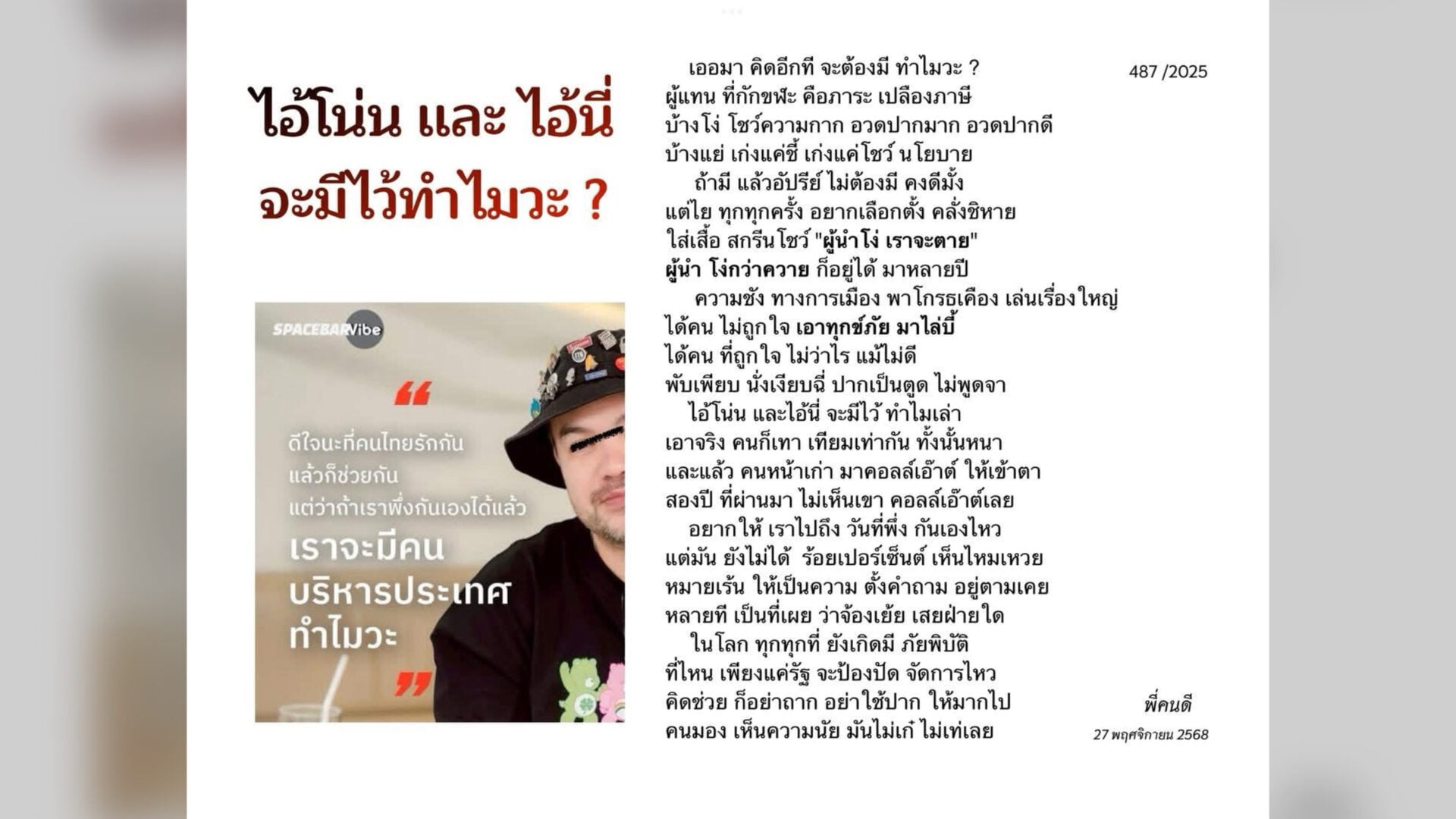 27 พฤศจิกายน 2568 - เพจ P.khondee (พี่คนดี กวีสมัครเล่น) โพสต์บทกลอนในเฟซบุ๊กระบุว่า