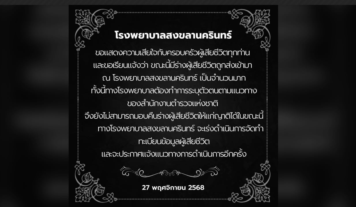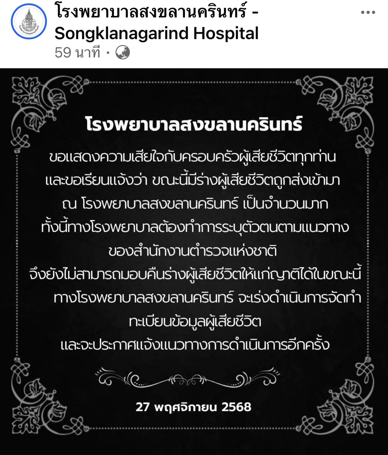 27 พฤศจิกายน 2568 - เมื่อเวลา 16.30 น. เพจโรงพยาบาลสงขลานครินทร์-Songklanagarind Hospital โพสต์ว่าโรงพยาบาลสงขลานครินทร์ ขอแสดงความเสียใจกับครอบครัวผู้เสียชีวิตทุกท่าน และขอเรียนแจ้งว่า ขณะนี้มีร่างผู้เสียชีวิตถูกส่งเข้ามา ณ โรงพยาบาลสงขลานครินทร์ เป็นจำนวนมาก