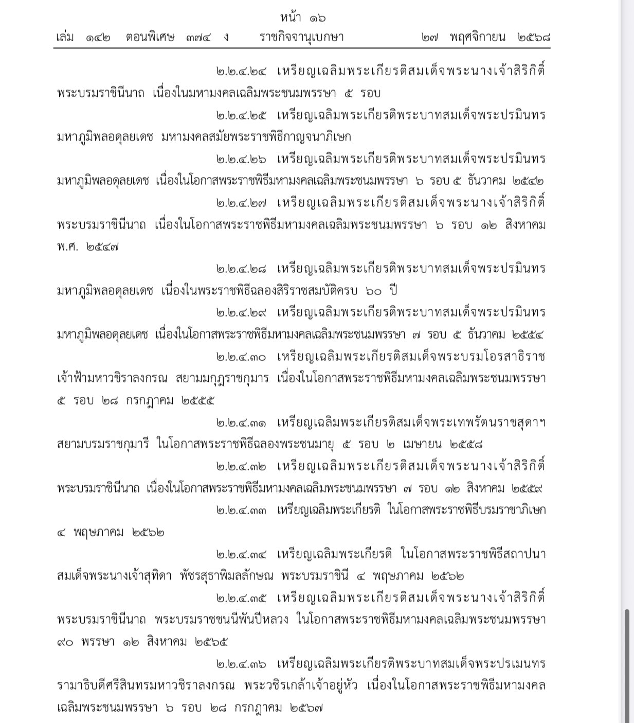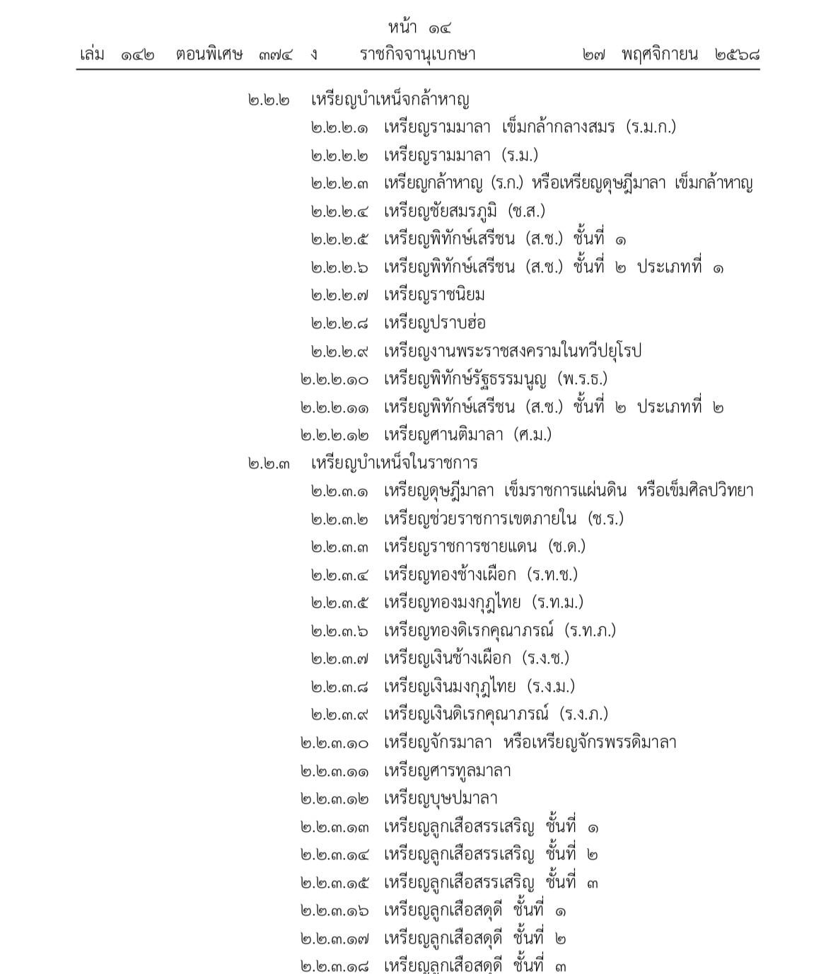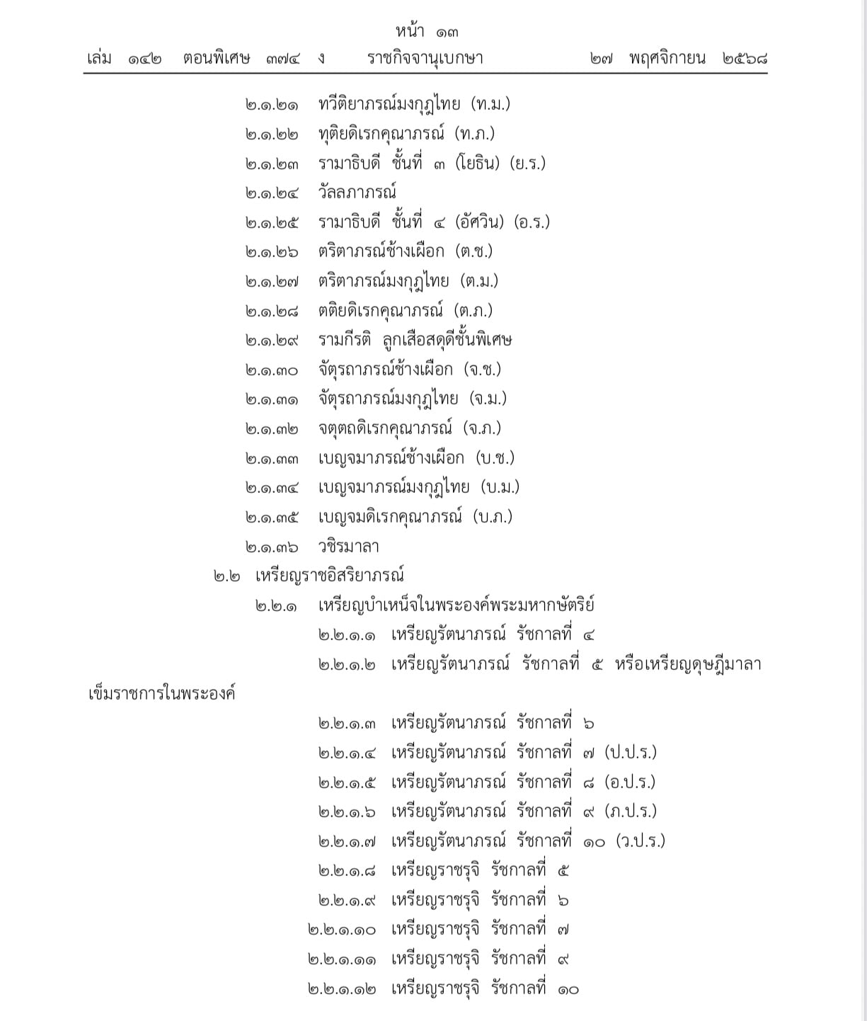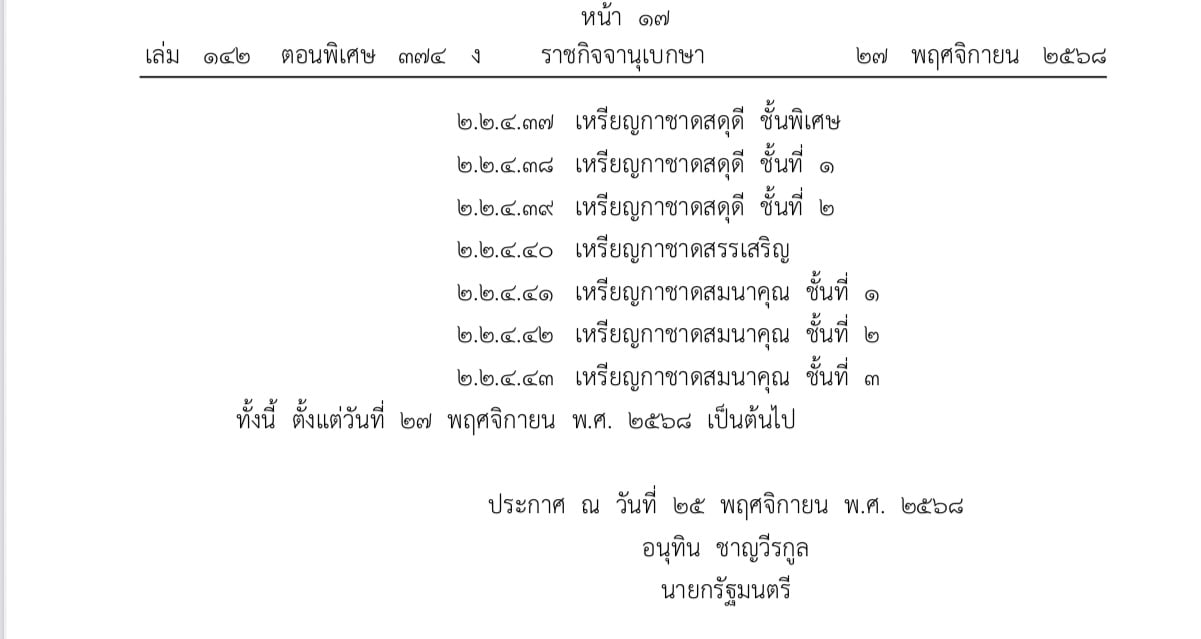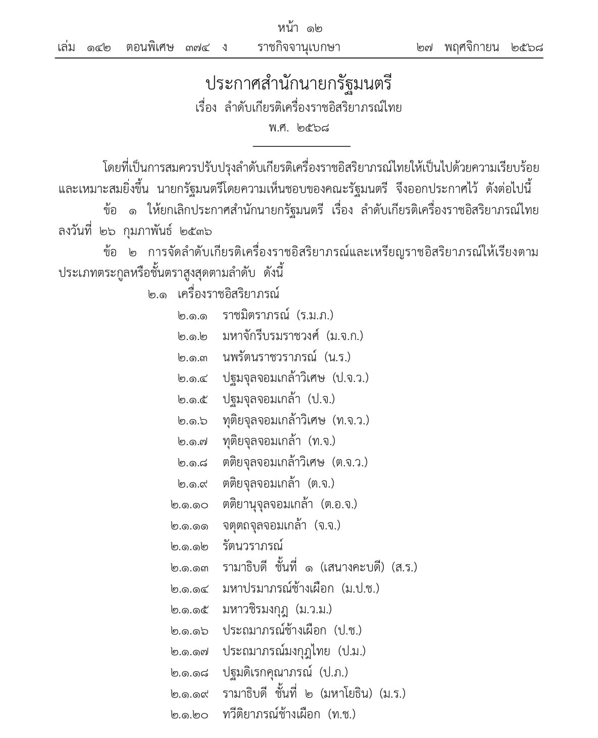 28 พฤศจิกายน 2568 - เว็บไซต์ราชกิจจานุเบกษา เผยแพร่ประกาศสำนักนายกรัฐมนตรีเรื่อง ลำดับเกียรติเครื่องราชอิสริยาภรณ์ไทย พ.ศ. ๒๕๖๘