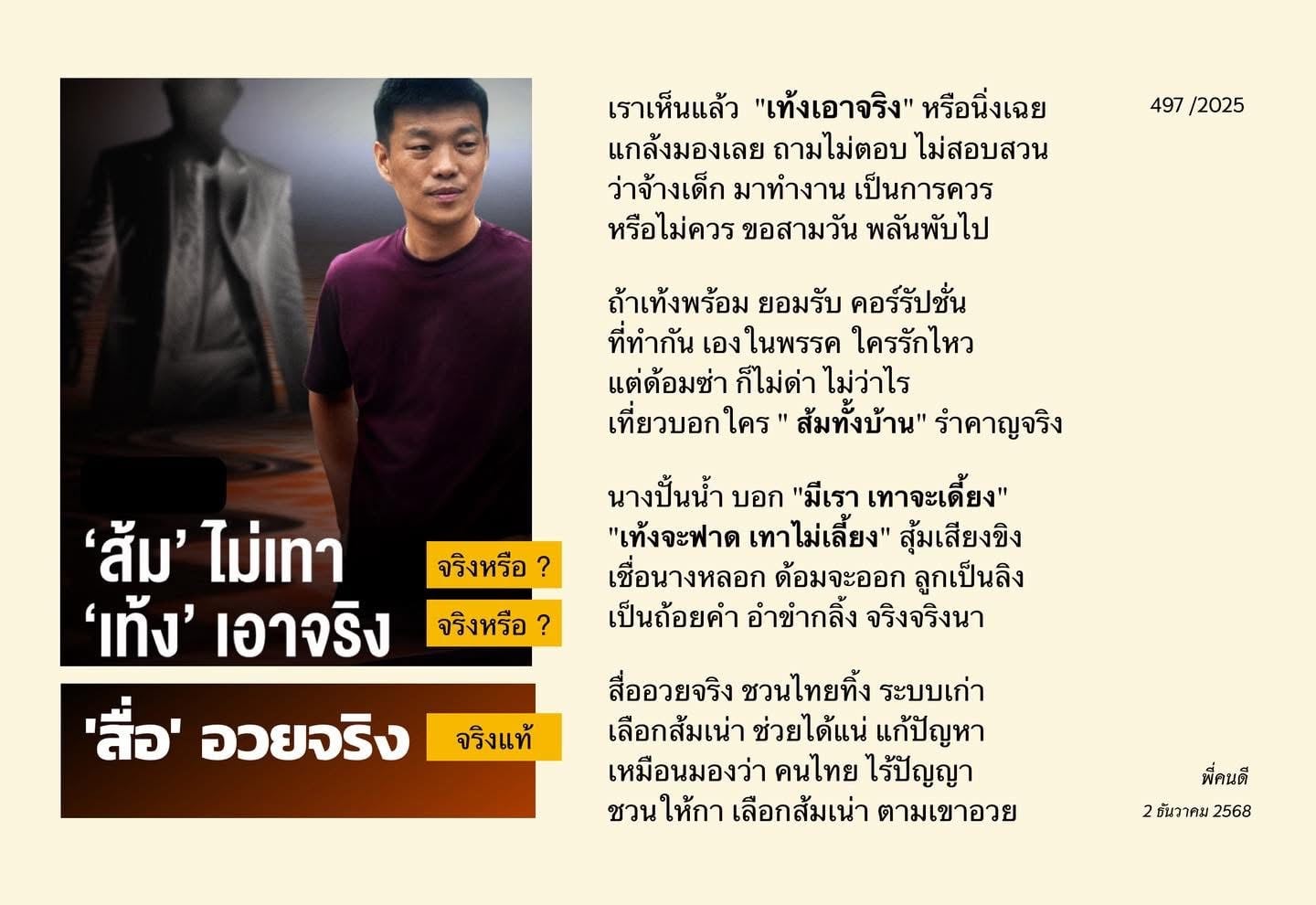 2 ธันวาคม 2568 - เพจ P.khondee (พี่คนดี กวีสมัครเล่น) โพสต์บทกลอนในเฟซบุ๊กระบุว่า