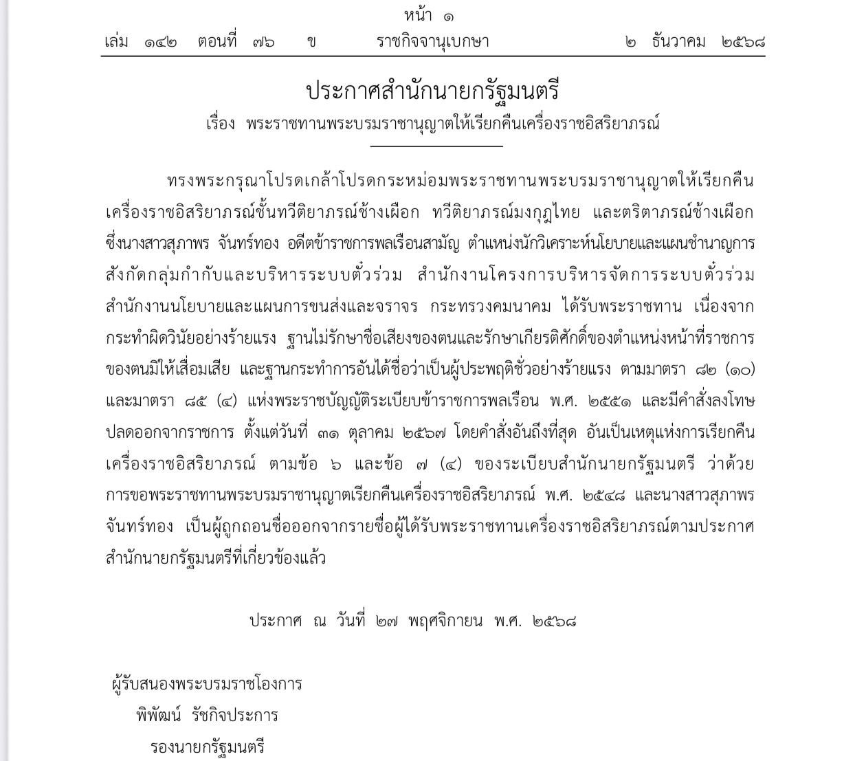 ทรงพระกรุณาโปรดเกล้าโปรดกระหม่อมพระราชทานพระบรมราชานุญาตให้เรียกคืนเครื่องราชอิสริยาภรณ์ชั้นทวีติยาภรณ์ช้างเผือก ทวีติยาภรณ์มงกุฎไทย และตริตาภรณ์ช้างเผือก ซึ่งนางสาวสุภาพร จันทร์ทอง อดีตข้าราชการพลเรือนสามัญ ตำแหน่งนักวิเคราะห์นโยบายและแผนชำนาญการ สังกัดกลุ่มกำกับและบริหารระบบตั๋วร่วม สำนักงานโครงการบริหารจัดการระบบตั๋วร่วม สำนักงานนโยบายและแผนการขนส่งและจราจร กระทรวงคมนาคม ได้รับพระราชทาน เนื่องจากกระทำผิดวินัยอย่างร้ายแรง ฐานไม่รักษาชื่อเสียงของตนและรักษาเกียรติศักดิ์ของตำแหน่งหน้าที่ราชการของตนมิให้เสื่อมเสีย และฐานกระทำการอันได้ชื่อว่าเป็นผู้ประพฤติชั่วอย่างร้ายแรง ตามมาตรา ๘๒ (๑๐) และมาตรา ๘๕ (๔) แห่งพระราชบัญญัติระเบีย ข้าราชการพลเรือน พ.ศ. ๒๕๕๑ และมีคำสั่งลงโทษ ปลดออกจากราชการ ตั้งแต่วันที่ ๓๑ ตุลาคม ๒๕๖๗ โดยคำสั่งอันถึงที่สุด อันเป็นเหตุแห่งการเรียกคืนเครื่องราชอิสริยาภรณ์ ตามข้อ ๖ และข้อ ๗ (๔) ของระเบียบสำนักนายกรัฐมนตรี ว่าด้วย การขอพระราชทานพระบรมราชานุญาตเรียกคืนเครื่องราชอิสริยาภรณ์ พ.ศ. ๒๕๔๘ และนางสาวสุภาพร จันทร์ทอง เป็นผู้ถูกถอนชื่อออกจากรายชื่อผู้ได้รับพระราชทานเครื่องราชอิสริยาภรณ์ตามประกาศสำนักนายกรัฐมนตรีที่เกี่ยวข้องแล้ว