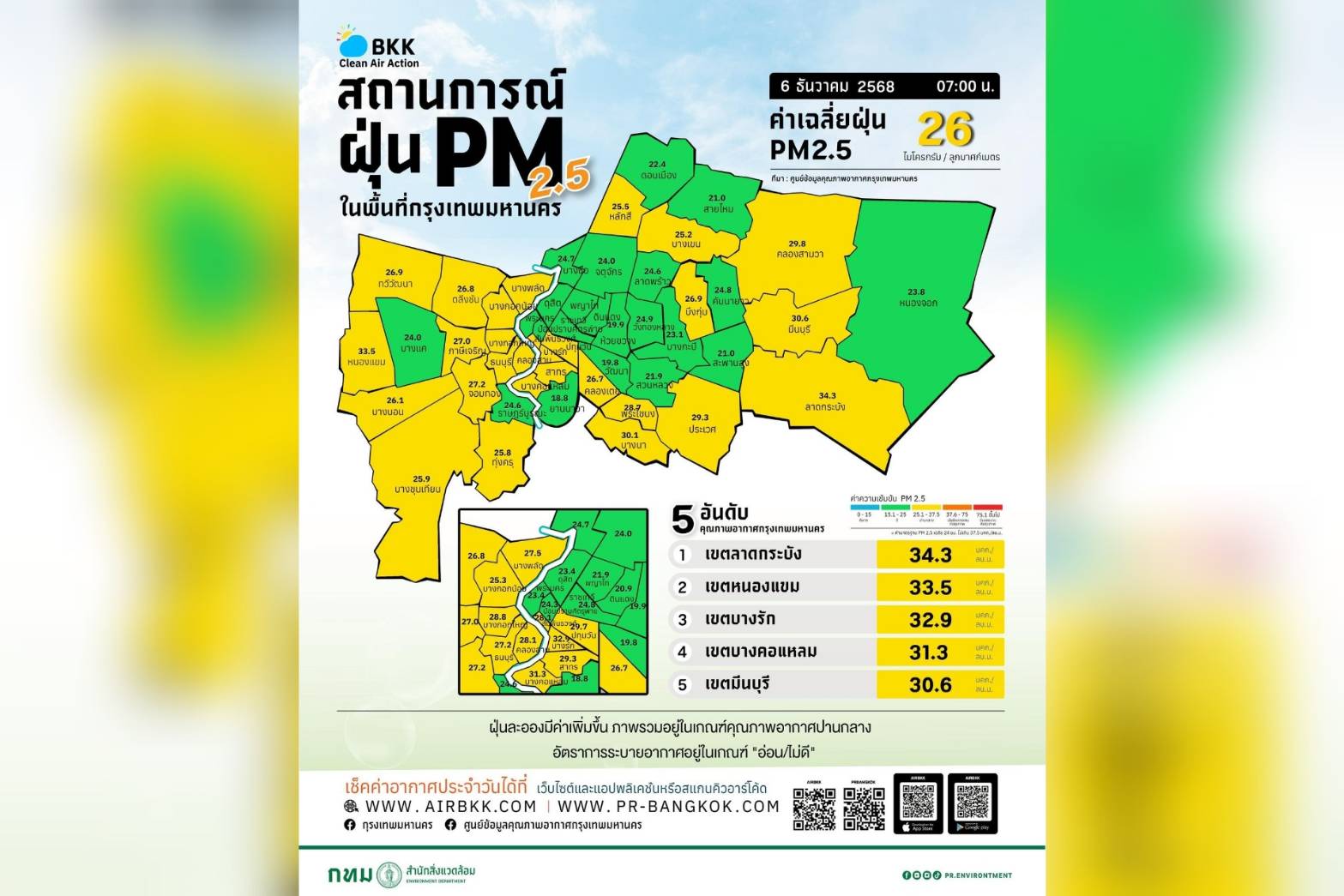 6 ธ.ค.2568-ศูนย์ข้อมูลคุณภาพอากาศกรุงเทพมหานคร รายงานสถานการณ์ฝุ่นละอองขนาดไม่เกิน 2.5 ไมครอน (PM 2.5) ในกรุงเทพมหานคร ประจำวันที่ 6 ธันวาคม 2568 เวลา 07:00 น. ค่าเฉลี่ยของกรุงเทพมหานคร 26 ไมโครกรัมต่อลูกบาศก์เมตร (มคก./ลบ.ม.) (ค่ามาตรฐาน 37.5 มคก./ลบ.ม.)