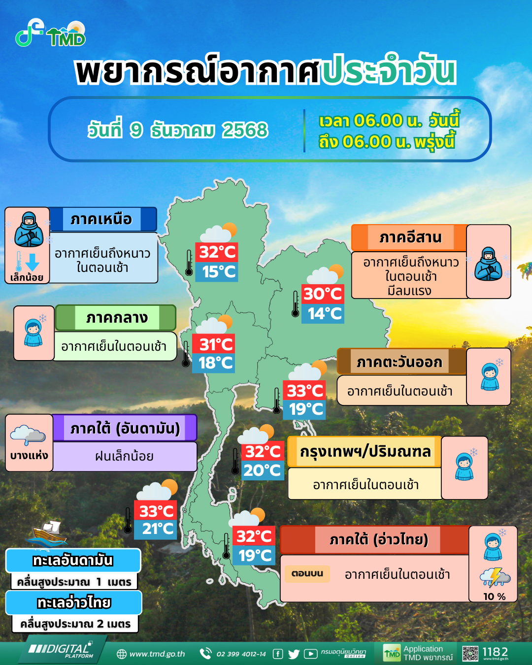 9 ธ.ค. 2568- กรมอุตุนิยมวิทยาพยากรณ์อากาศ 24 ชั่วโมงข้างหน้า ภาคเหนือและภาคตะวันออกเฉียงเหนือมีอากาศเย็นถึงหนาว ส่วนภาคกลาง รวมทั้งกรุงเทพมหานครและปริมณฑล ภาคตะวันออก และภาคใต้ตอนบนมีอากาศเย็นในตอนเช้า ขอให้ประชาชนในบริเวณดังกล่าวดูแลรักษาสุขภาพเนื่องจากสภาพอากาศที่หนาวเย็น รวมถึงระวังอันตรายจากอัคคีภัยที่อาจเกิดขึ้นจากสภาพอากาศแห้งและลมแรง เนื่องจากบริเวณความกดอากาศสูงหรือมวลอากาศเย็นกำลังปานกลางจากประเทศจีนได้แผ่ปกคลุมประเทศไทยตอนบน