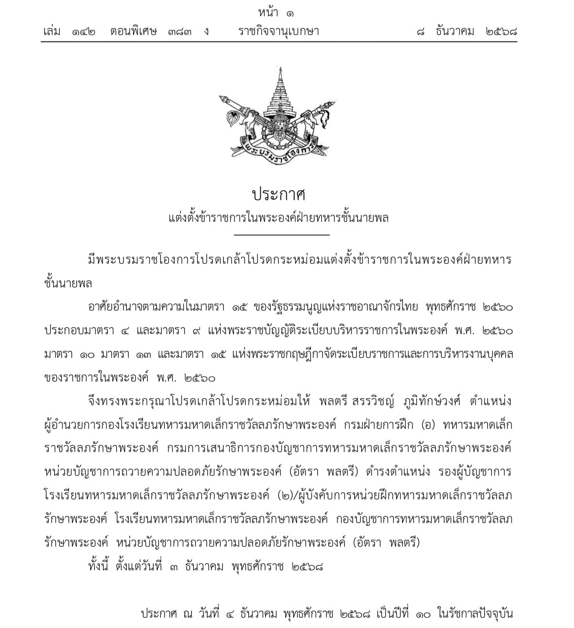 9 ธันวาคม 2568 - เว็บไซต์ราชกิจจานุเบกษา เผยแพร่ประกาศแต่งตั้งข้าราชการในพระองค์ฝ่ายทหารชั้นนายพล