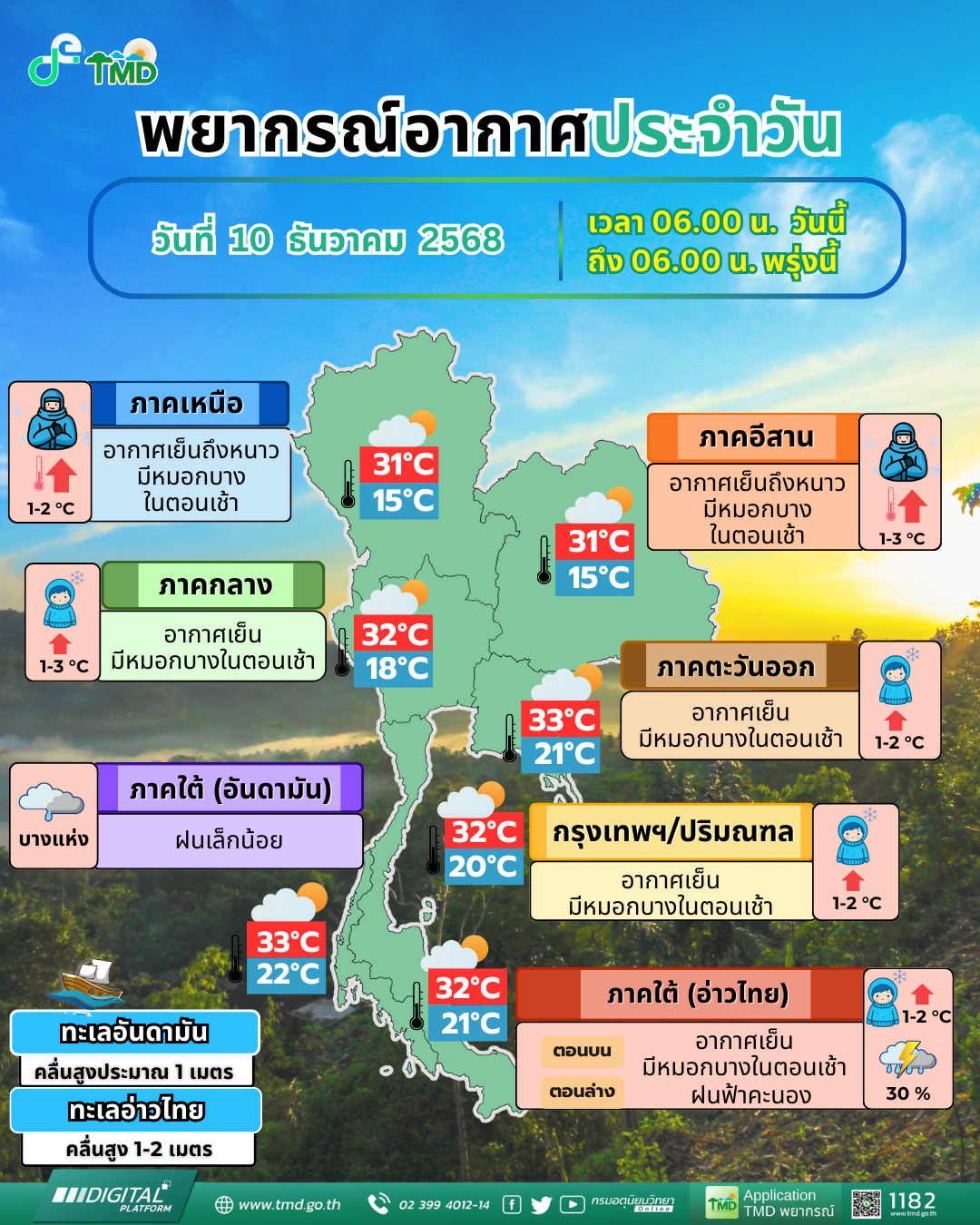 10 ธ.ค.2568 - กรมอุตุนิยมวิทยาได้พยากรณ์อากาศ 24 ชั่วโมงข้างหน้าในลักษณะทั่วไป ว่าประเทศไทยตอนบนมีอุณหภูมิสูงขึ้นกับมีหมอกบางในตอนเช้า แต่ยังคงมีอากาศเย็นถึงหนาว ขอให้ประชาชนดูแลรักษาสุขภาพเนื่องจากสภาพอากาศที่หนาวเย็น และเพิ่มความระมัดระวังในการสัญจรผ่านบริเวณที่มีหมอก รวมถึงระวังอันตรายจากอัคคีภัยที่อาจเกิดขึ้นจากสภาพอากาศแห้ง ทั้งนี้เนื่องจากบริเวณความกดอากาศสูงหรือมวลอากาศเย็นที่ปกคลุมประเทศไทยตอนบนเริ่มมีกำลังอ่อนลง