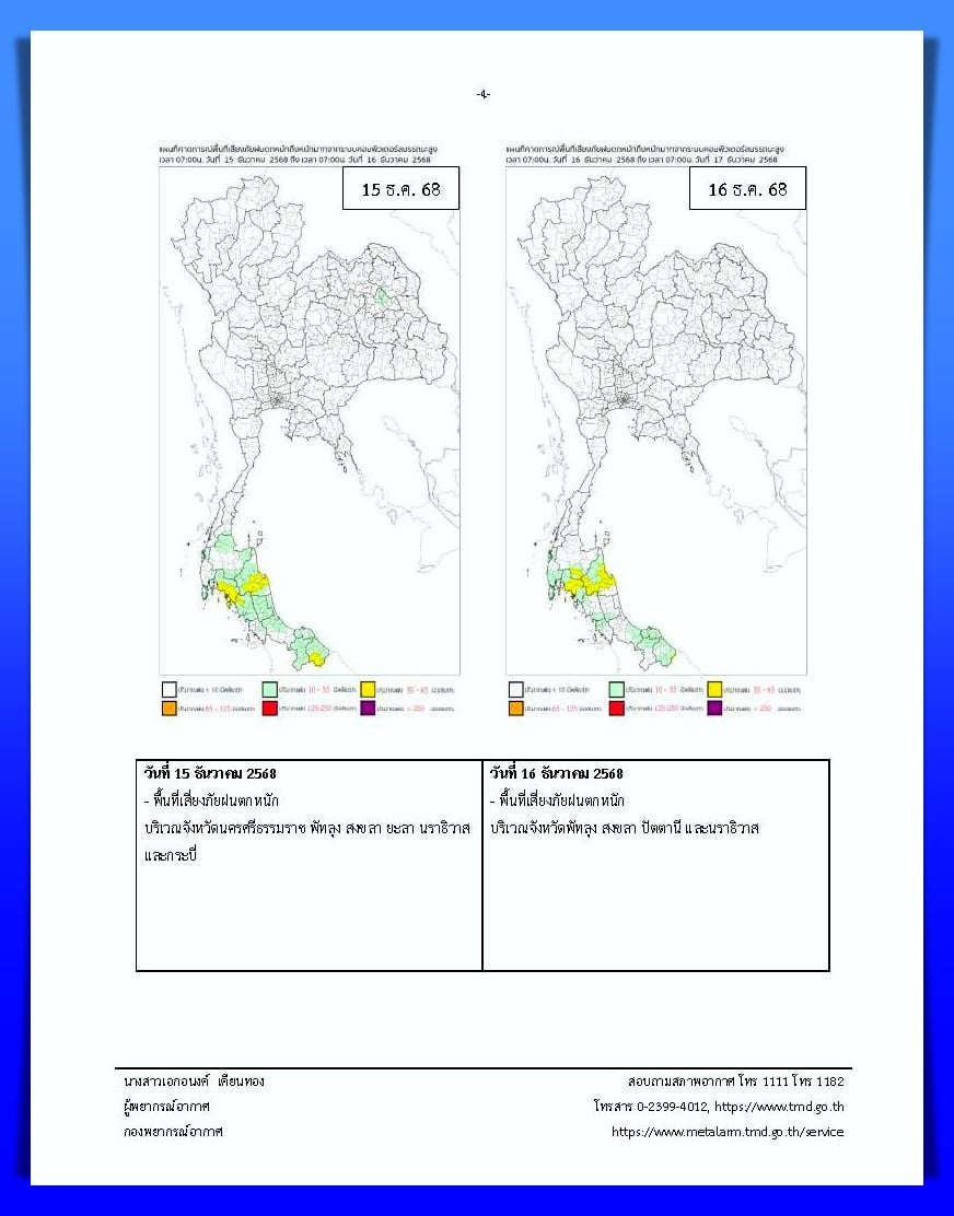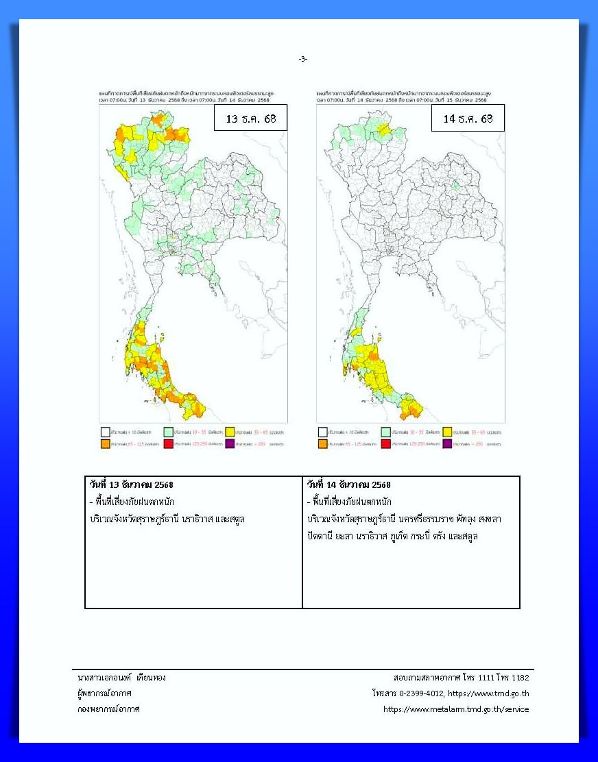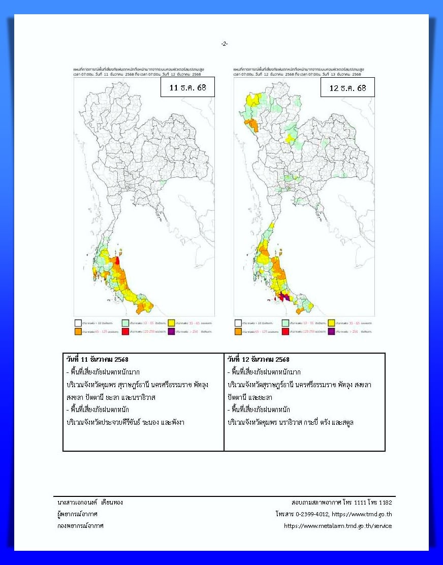 ในช่วงวันที่ 11-13 ธ.ค. 68 ภาคใต้มีฝนเพิ่มขึ้นและมีฝนตกหนักหลายพื้นที่บริเวณจังหวัดประจวบคีรีขันธ์ ระนอง พังงา กระบี่ ตรัง และสตูล โดยมีฝนตกหนักมากบริเวณจังหวัดชุมพร สุราษฎร์ธานี นครศรีธรรมราช พัทลุง สงขลา ปัตตานี ยะลา และนราธิวาส ทั้งนี้เนื่องจากมีหย่อมความกดอากาศต่ำบริเวณทะเลจีนใต้ตอนล่างจะเคลื่อนผ่านปลายแหลมญวน อ่าวไทย และภาคใต้ ส่วนในช่วงวันที่ 14-16 ธ.ค. 68 ภาคใต้ตอนล่างยังคงมีฝนตกหนักหลายพื้นที่อย่างต่อเนื่อง บริเวณจังหวัดสุราษฎร์ธานี นครศรีธรรมราช พัทลุง สงขลา ปัตตานี ยะลา นราธิวาส กระบี่ ตรัง และสตูล เนื่องจากมรสุมตะวันออกเฉียงเหนือที่พัดปกคลุมอ่าวไทยและภาคใต้จะมีกำลังแรงขึ้น สำหรับคลื่นลมบริเวณอ่าวไทยและทะเลอันดามันจะมีกำลังแรงขึ้น โดยอ่าวไทยตอนล่างมีคลื่นสูง 2-3 เมตร บริเวณฝนฟ้าคะนองคลื่นสูงมากกว่า 3 เมตร อ่าวไทยตอนบนมีคลื่นสูงประมาณ 2 เมตร ส่วนทะเลอันดามันห่างฝั่งมีคลื่นสูงมากกว่า 2 เมตร บริเวณฝนฟ้าคะนองคลื่นสูงมากกว่า 2 เมตร