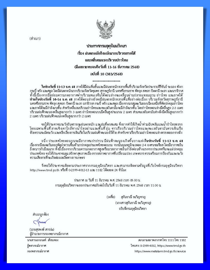 11 ธ.ค.2568 - นางสาวสุกันยาณี ยะวิญชาญ อธิบดีกรมอุตุนิยมวิทยา ออกประกาศกรมอุตุนิยมวิทยา เรื่อง ฝนตกหนักถึงหนักมากบริเวณภาคใต้และคลื่นลมแรงบริเวณอ่าวไทย (มีผลกระทบจนถึงวันที่ 11-16 ธันวาคม 2568) ฉบับที่ 10 (383/2568) ระบุว่า