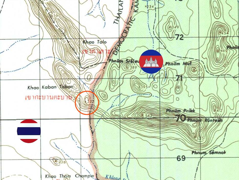 ล่าสุด เพจเฟซบ๊ก "Thai Burma railway ทางรถไฟสายมรณะ" โพสต์ข้อความว่า เนิน 323 ที่ทหารพรานจากกองทัพภาคที่ 1 ชักธงชาติ เนินนี้อยู่บริเวณรอยต่อของคลองหาด สระแก้ว และ สอยดาว จันทบุรี ซึ่งฝั่งตรงข้ามคือจังหวัดพระตะบองของเขมร