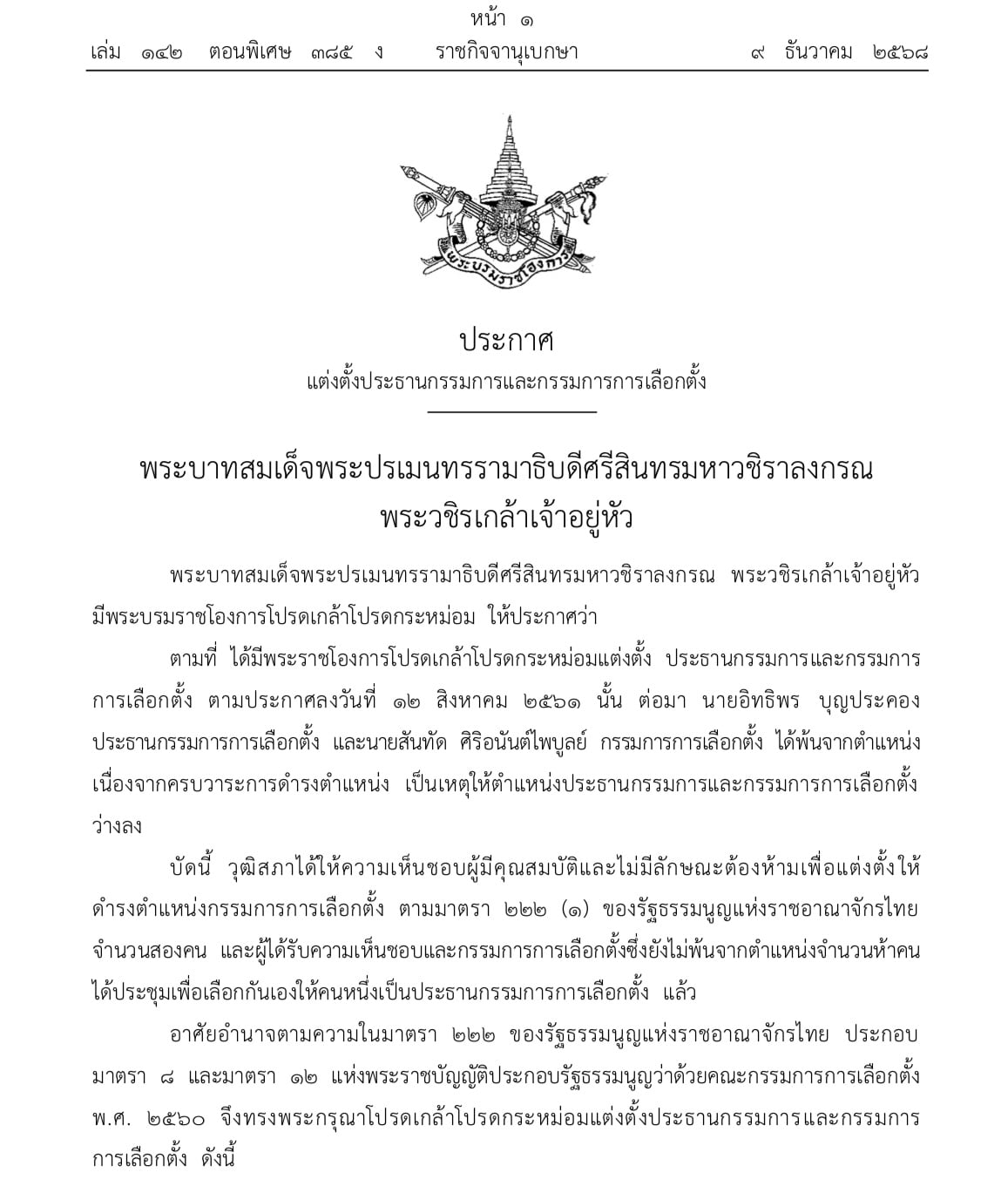 ตามที่ ได้มีพระราชโองการโปรดเกล้าโปรดกระหม่อมแต่งตั้ง ประธานกรรมการและกรรมการการเลือกตั้ง ตามประกาศลงวันที่ ๑๒ สิงหาคม ๒๕๖๑ นั้น ต่อมา นายอิทธิพร บุญประคอง ประธานกรรมการการเลือกตั้ง และนายสันทัด ศิริอนันต์ไพบูลย์ กรรมการการเลือกตั้ง ได้พ้นจากตำแหน่งเนื่องจากครบวาระการดำรงตำแหน่ง เป็นเหตุให้ตำแหน่งประธานกรรมการและกรรมการการเลือกตั้งว่างลง