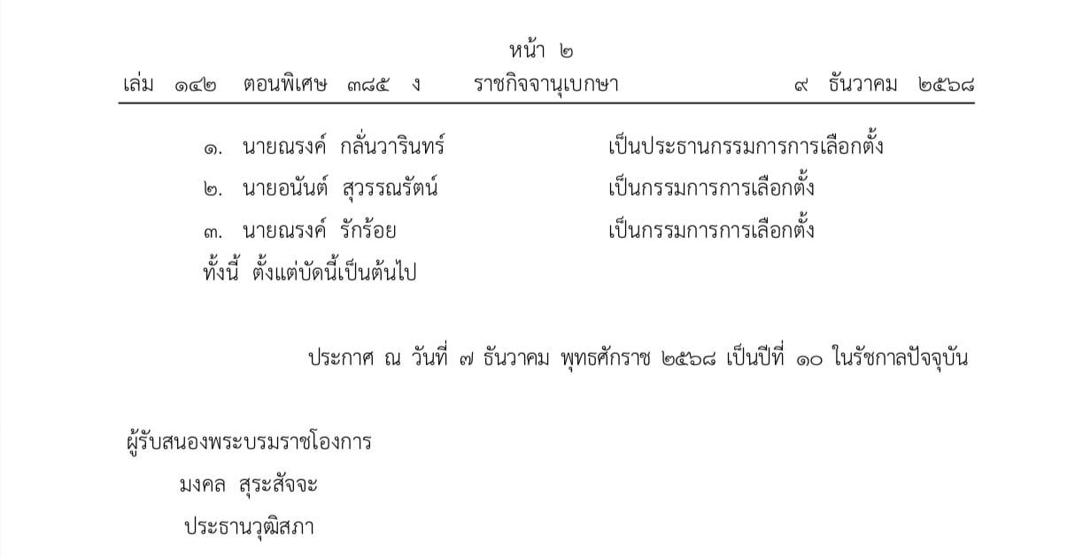 11 ธันวาคม 2568 - เว็บไซต์ราชกิจจานุเบกษา เผยแพร่ประกาศแต่งตั้งประธานกรรมการและกรรมการการเลือกตั้ง