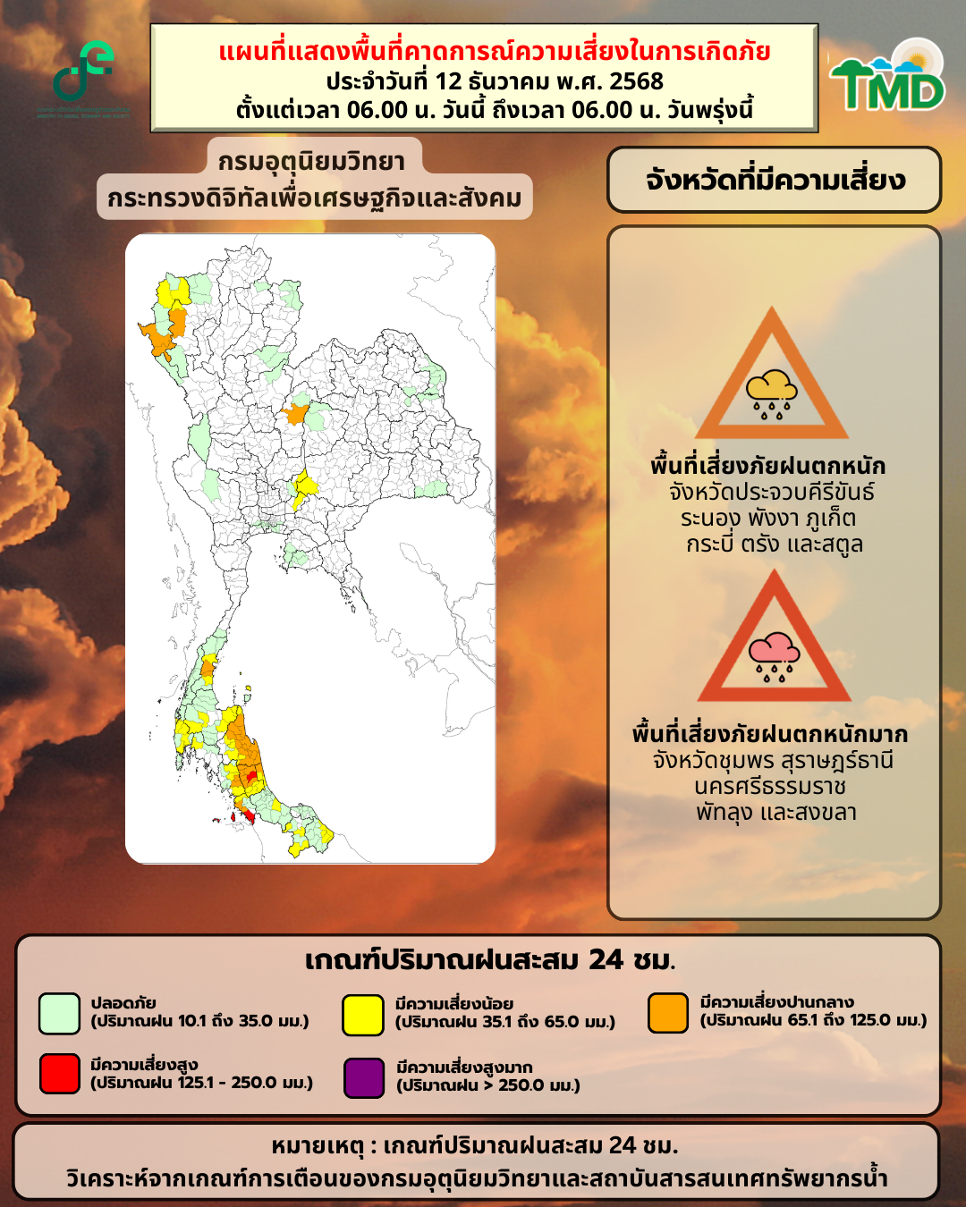 12 ธ.ค. 2568 – กรมอุตุนิยมวิทยา ออกประกาศเรื่อง “ฝนตกหนักถึงหนักมากบริเวณภาคใต้ และคลื่นลมแรงบริเวณอ่าวไทย” (มีผลกระทบจนถึงวันที่ 12-16 ธันวาคม 2568) ฉบับที่ 15 มีใจความว่า