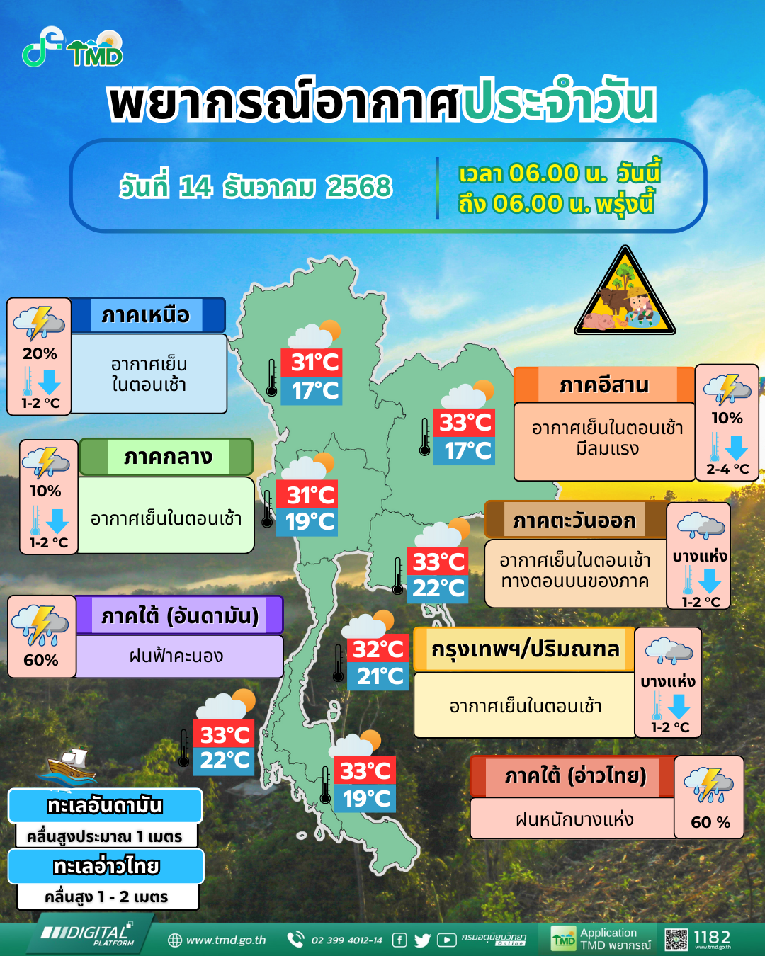 14 ธ.ค. 2568 – กรมอุตุนิยมวิทยา พยากรณ์อากาศ 24 ชั่วโมงข้างหน้า ภาคใต้จะมีฝนตกต่อเนื่องและมีฝนตกหนักบางแห่ง โดยเฉพาะบริเวณจังหวัดชุมพร สุราษฎร์ธานี นครศรีธรรมราช พัทลุง สงขลา ปัตตานี ยะลา และนราธิวาส เนื่องจากมรสุมตะวันออกเฉียงเหนือที่พัดปกคลุมอ่าวไทยตอนบน ภาคใต้ตอนบน และทะเลอันดามันมีกำลังแรงขึ้น ส่วนคลื่นลมบริเวณอ่าวไทยตอนล่างมีกำลังแรงค่อนข้างแรง สำหรับคลื่นลมบริเวณอ่าวไทยและทะเลอันดามันจะมีกำลังแรงขึ้น โดยอ่าวไทยตอนล่างมีคลื่นสูง 2-3 เมตร บริเวณที่มีฝนฟ้าคะนองคลื่นสูงมากกว่า 3 เมตร อ่าวไทยตอนบนมีคลื่นสูงประมาณ 2 เมตร บริเวณที่มีฝนฟ้าคะนองคลื่นสูงมากกว่า 2 เมตร ส่วนทะเลอันดามันมีคลื่นสูง 1-2 เมตร ห่างฝั่งและบริเวณที่มีฝนฟ้าคะนองคลื่นสูงมากกว่า 2 เมตร ขอให้ชาวเรือบริเวณอ่าวไทยและทะเลอันดามันเดินเรือด้วยความระมัดระวัง และหลีกเลี่ยงการเดินเรือในบริเวณที่มีฝนฟ้าคะนองตลอดช่วง ส่วนเรือเล็กบริเวณอ่าวไทยตอนล่างควรงดออกจากฝั่งในช่วงวันที่ 14-16 ธ.ค. นี้ไว้ด้วย
