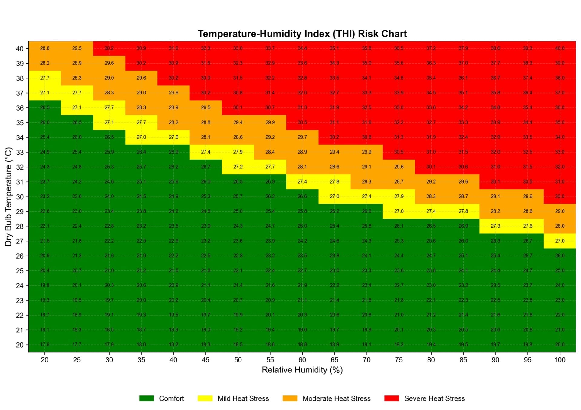ทำไมควรใช้ตารางนี้? ช่วยบอกค่า “ความร้อนจริงที่สัตว์รู้สึก” ได้แม่นยำกว่าดูแค่ปรอทวัดอุณหภูมิ เพื่อการตัดสินใจเปิดพัดลมหรือพ่นน้ำได้ทันเวลา ลดความเสียหายก่อนสายเกินไป