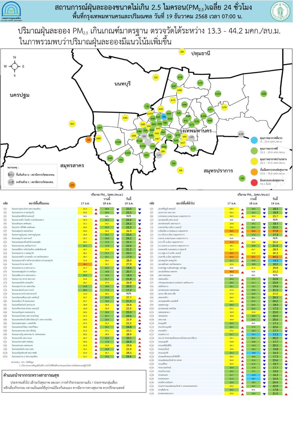 19 ธ.ค. 2568 – ศูนย์สื่อสารการแก้ไขปัญหามลพิษทางอากาศ รายงานการติดตามตรวจสอบคุณภาพอากาศ ประจำวันที่ 19 ธันวาคม 2568 ณ 07:00 น. สรุปดังนี้