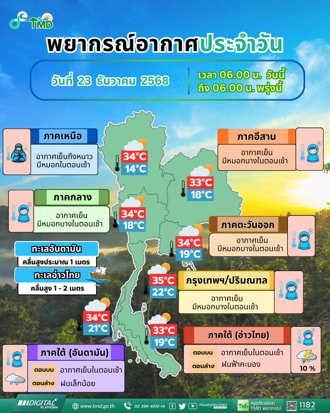 กรมอุตุนิยมวิทยา พยากรณ์อากาศ 24 ชั่วโมงข้างหน้า ประเทศไทยตอนบนมีอุณหภูมิสูงขึ้นและมีหมอกในตอนเช้า แต่ยังคงมีอากาศเย็นถึงหนา