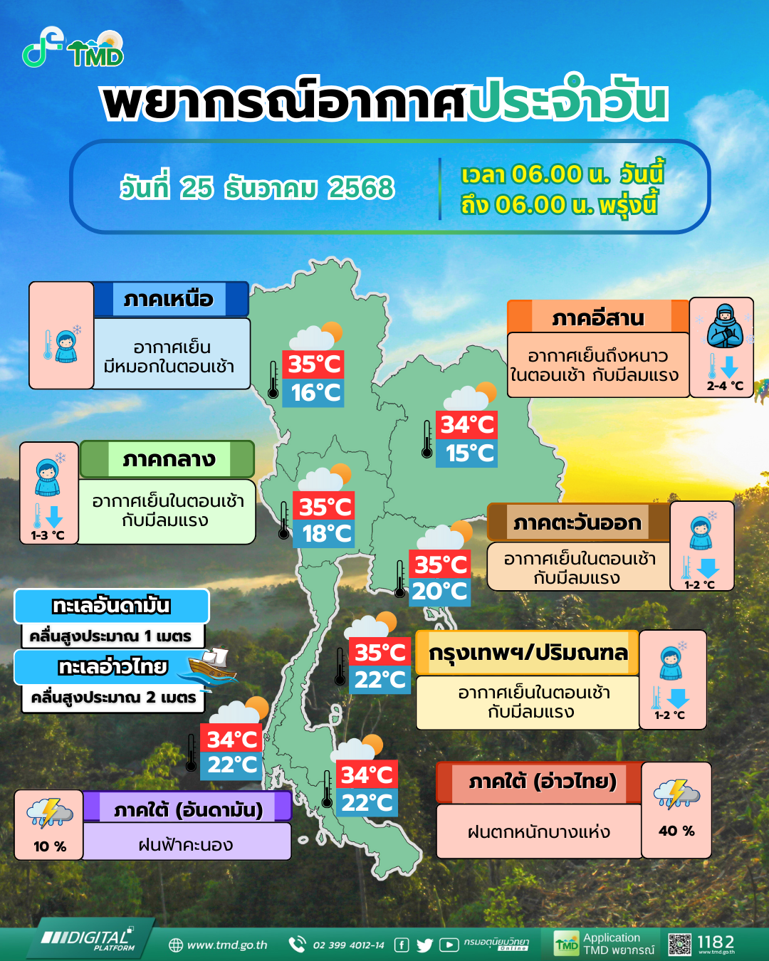 สำหรับประเทศไทยตอนบนจะมีอุณหภูมิลดลง กับมีลมแรง เนื่องจากบริเวณความกดอากาศสูงหรือมวลอากาศเย็นกำลังค่อนข้างแรงอีกระลอกหนึ่งจากประเทศจีนได้แผ่ลงมาปกคลุมประเทศจีนตอนใต้และประเทศเวียดนามตอนบนแล้ว คาดว่าจะแผ่ลงมาปกคลุมประเทศไทยตอนบนในวันนี้ (25 ธ.ค.) ขอให้ประชาชนบริเวณประเทศไทยตอนบนดูแลรักษาสุขภาพเนื่องจากสภาพอากาศที่หนาวเย็นลง รวมถึงให้ระวังอันตรายจากอัคคีภัยที่อาจเกิดขึ้นเนื่องจากอากาศแห้งและลมแรงไว้ด้วย